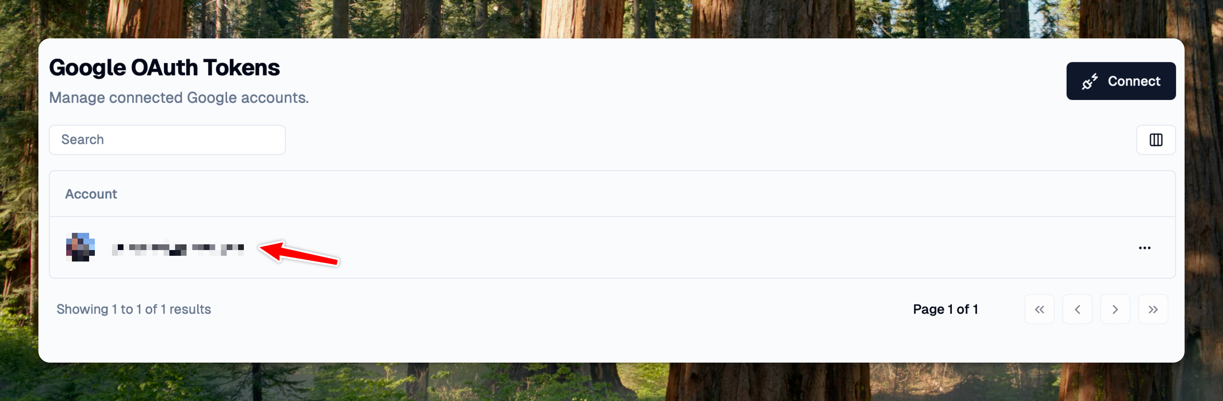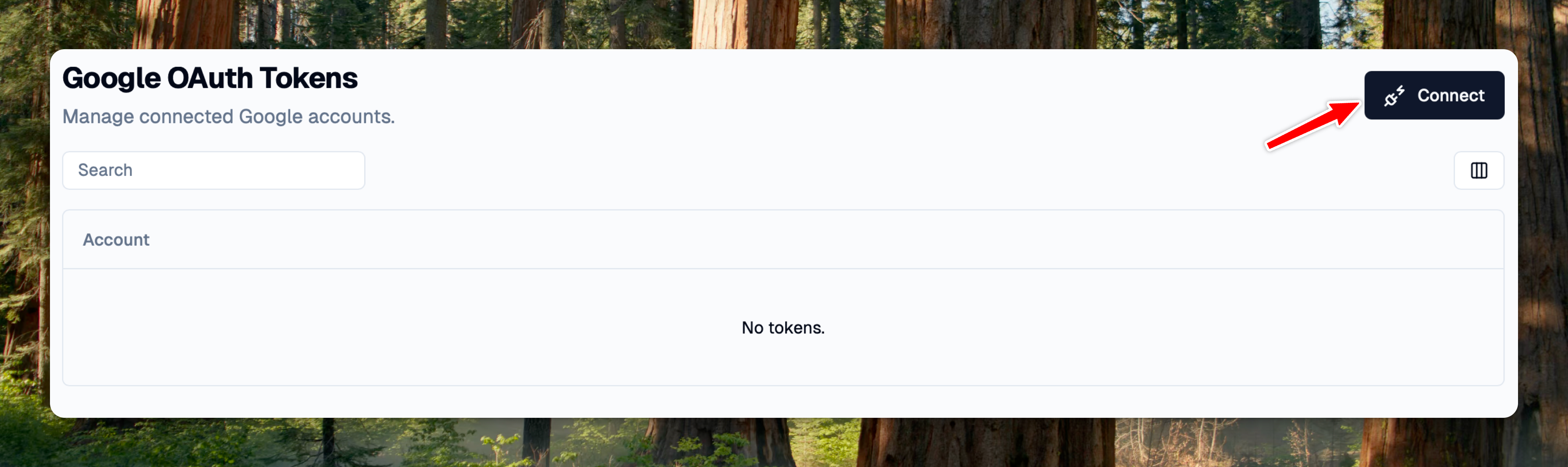 Click the "**Connect**" button in the top-right corner of the Google OAuth Tokens page.