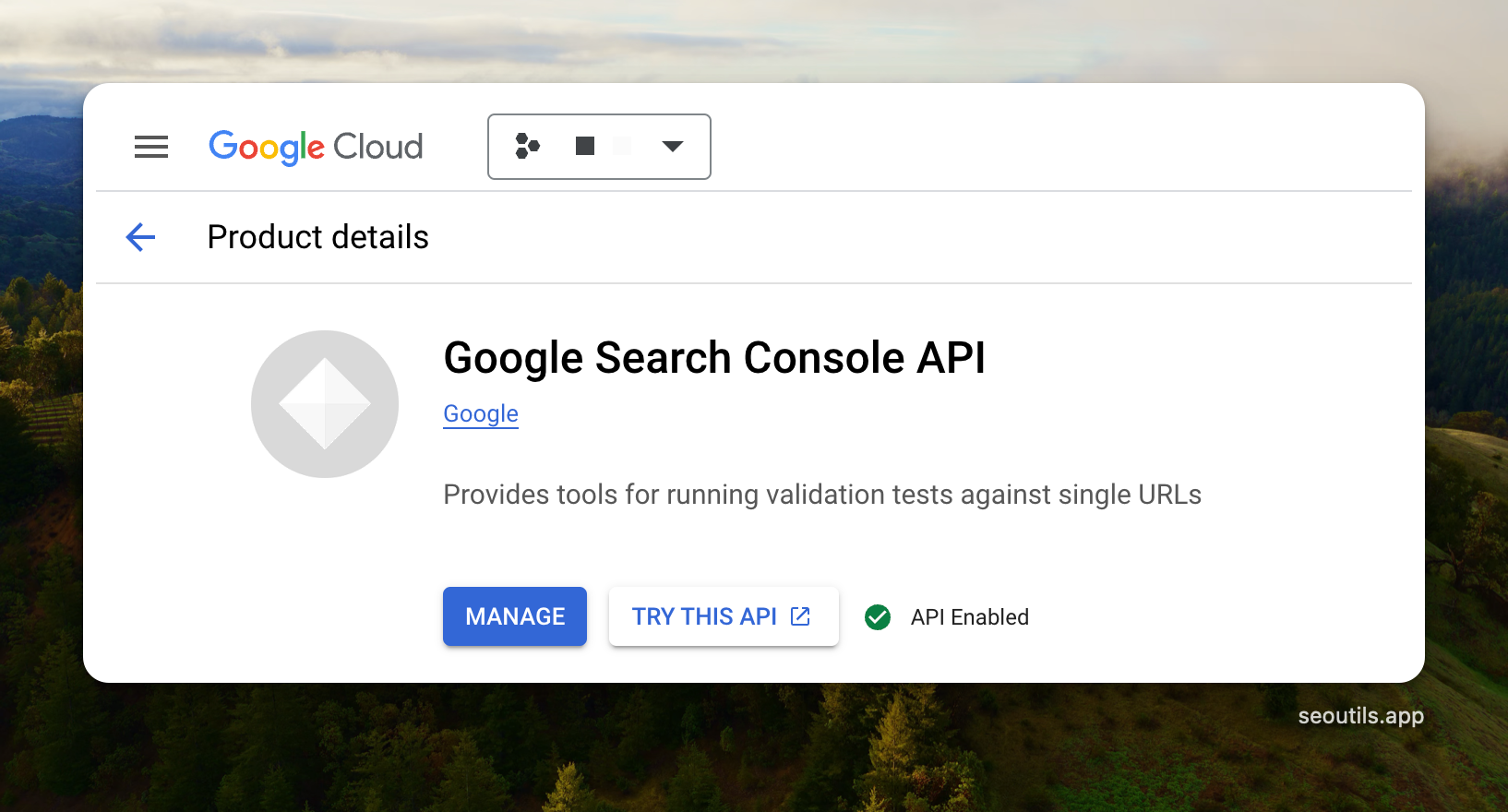 Visit the [Google Cloud Console](https://console.cloud.google.com/) and create a project if you don't have one. Then search for "**Google Search Console API**" in the top search bar, click on it, and hit **Enable**.
