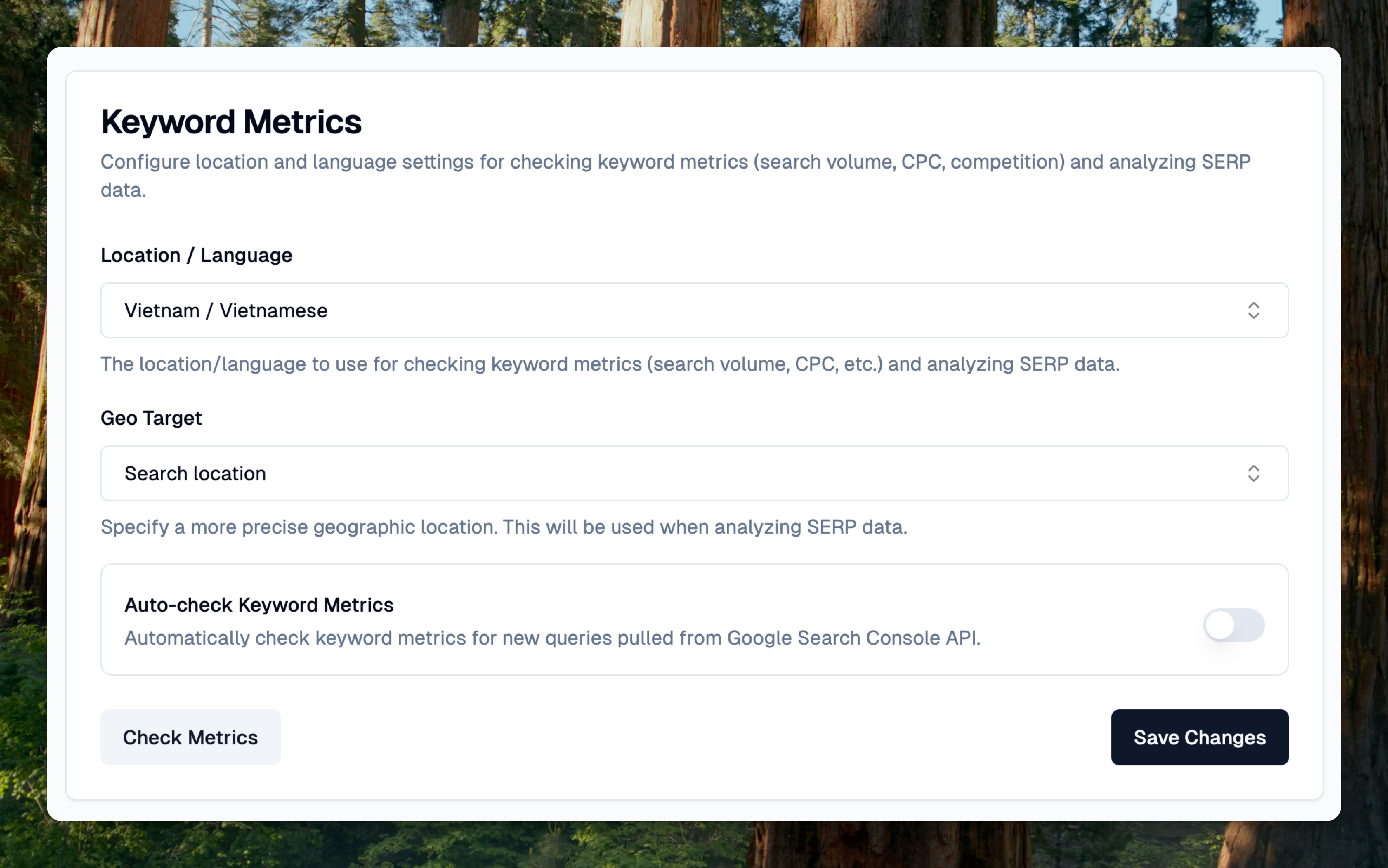 <figure><img src="https://1176579443-files.gitbook.io/~/files/v0/b/gitbook-x-prod.appspot.com/o/spaces%2F2DwV6sJBiKjUHMDggb4d%2Fuploads%2Fgit-blob-314d0552e2c4a4fa4f6327f0b19caeb88efee4e1%2FXnapper-2025-09-01-22.15.01.png?alt=media" alt=""><figcaption><p>Configure keyword metrics settings</p></figcaption></figure>