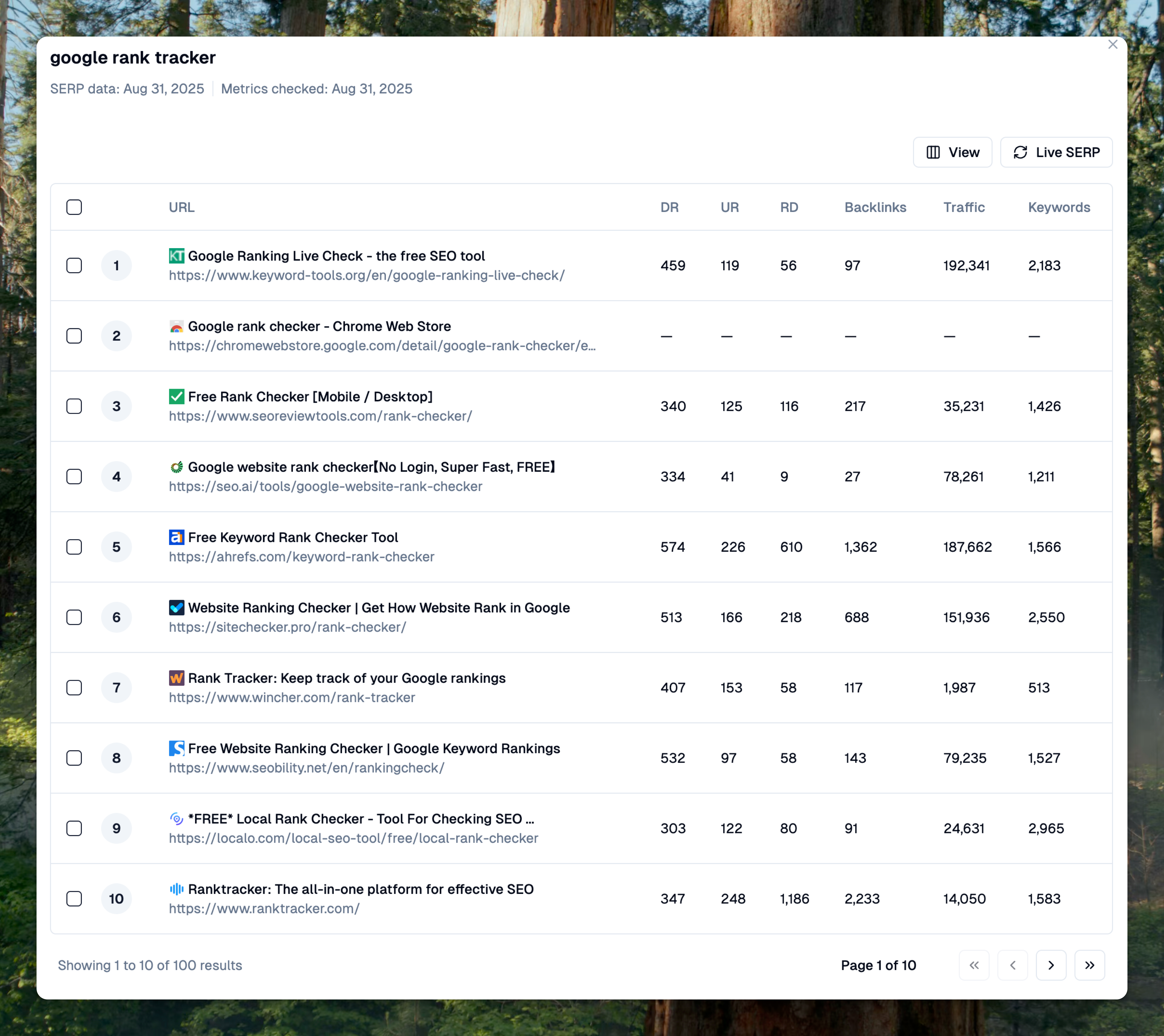 Click the "**Live SERP**" button next to any query to pull live SERP data. This shows the top-ranking pages for that keyword.