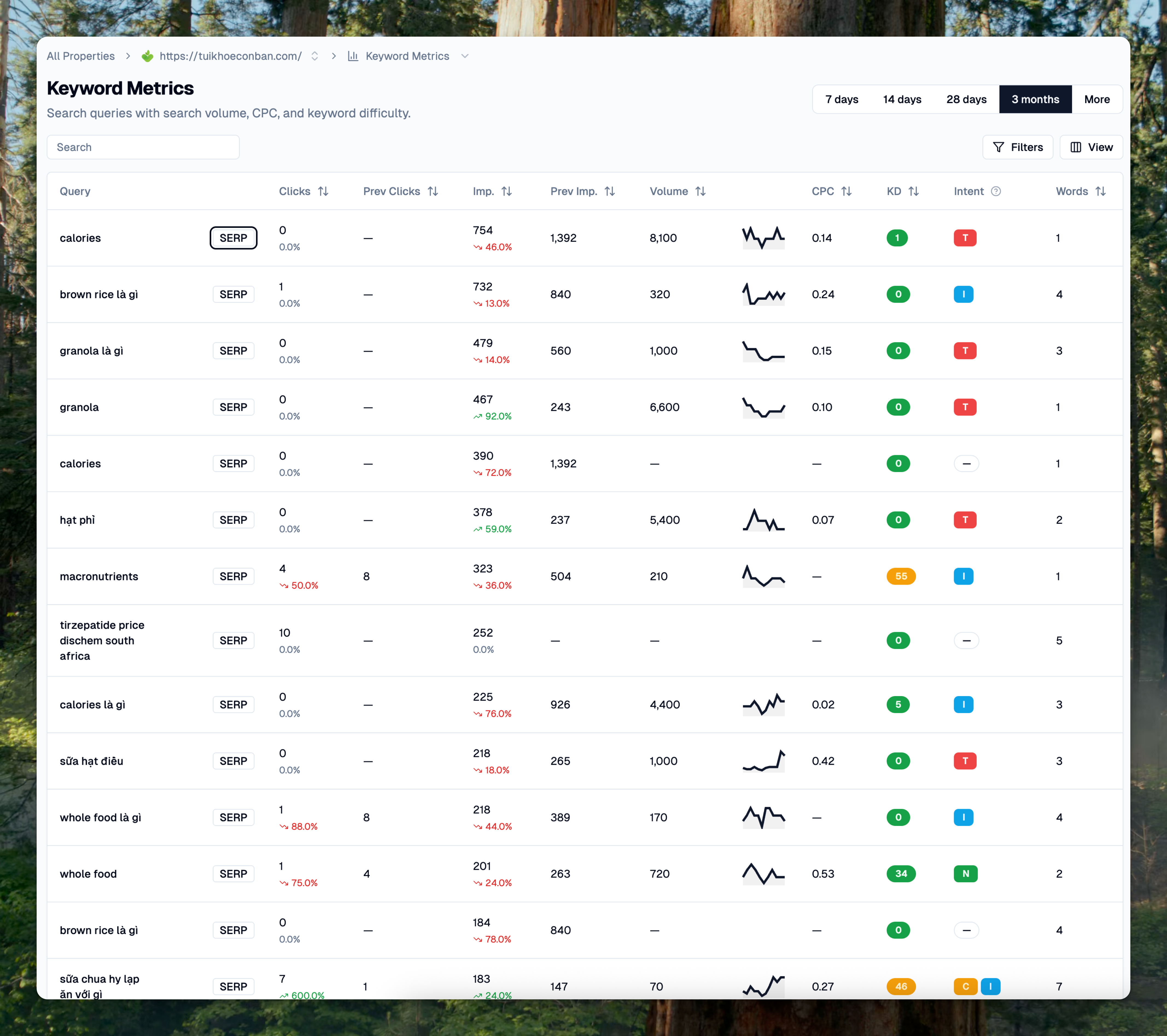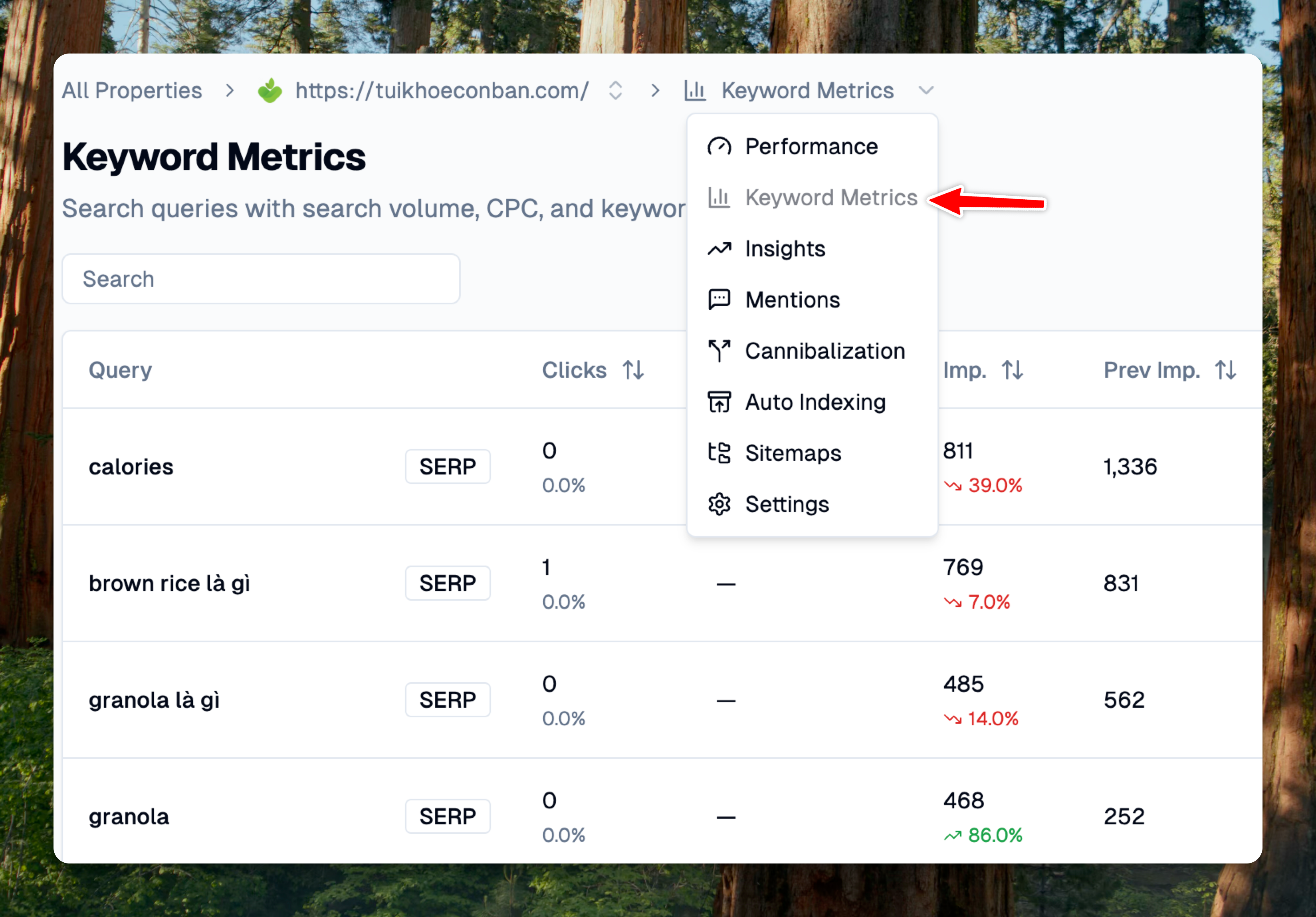 The **Keyword Metrics** feature enriches your Google Search Console queries with valuable SEO data like search volume, CPC, keyword difficulty, and competition metrics. You can also analyze SERP data to understand your competition better.