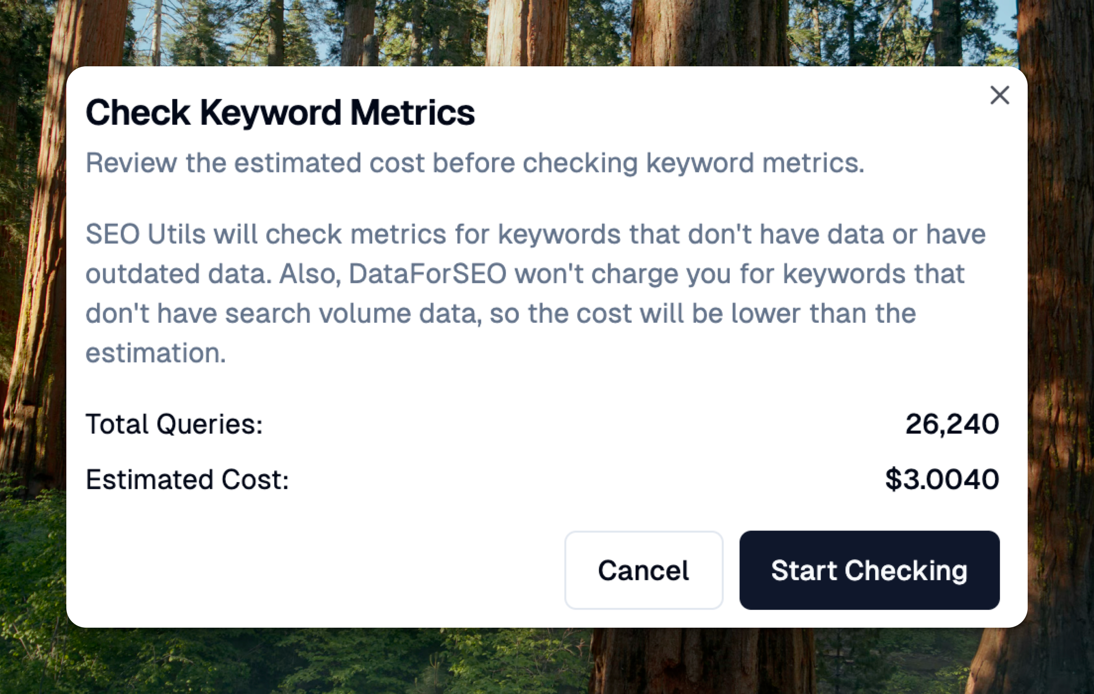 **Cost Note:** DataForSEO won't charge for keywords without search volume data, so actual costs will be lower than the estimation. SEO Utils only checks metrics for queries with missing or outdated data.
