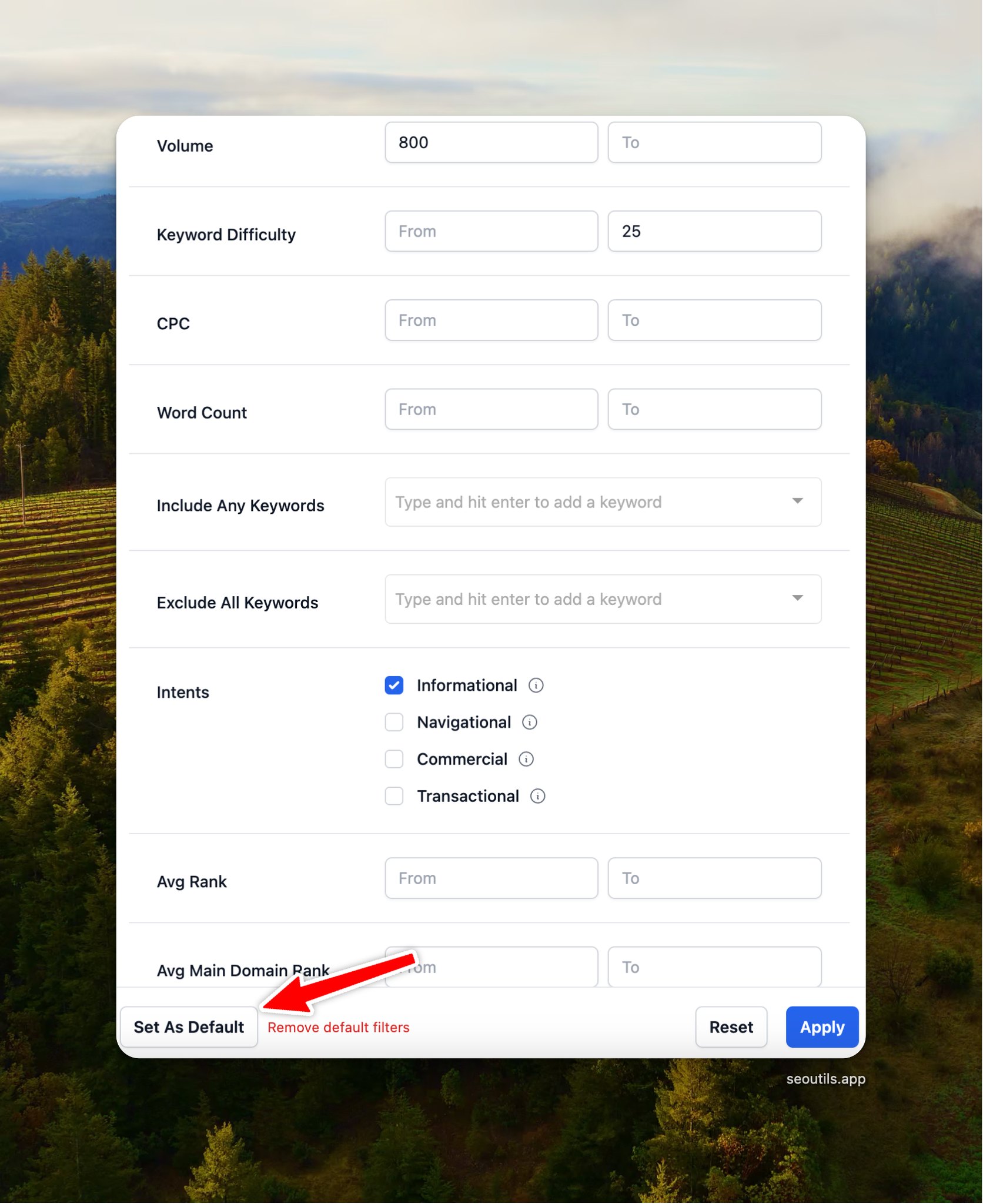 For example, I often look for keywords that get searched at least 800 times per month, have a Keyword Difficulty of no more than 25, and are used for informational purposes. I can set the default filters as shown in the following image.