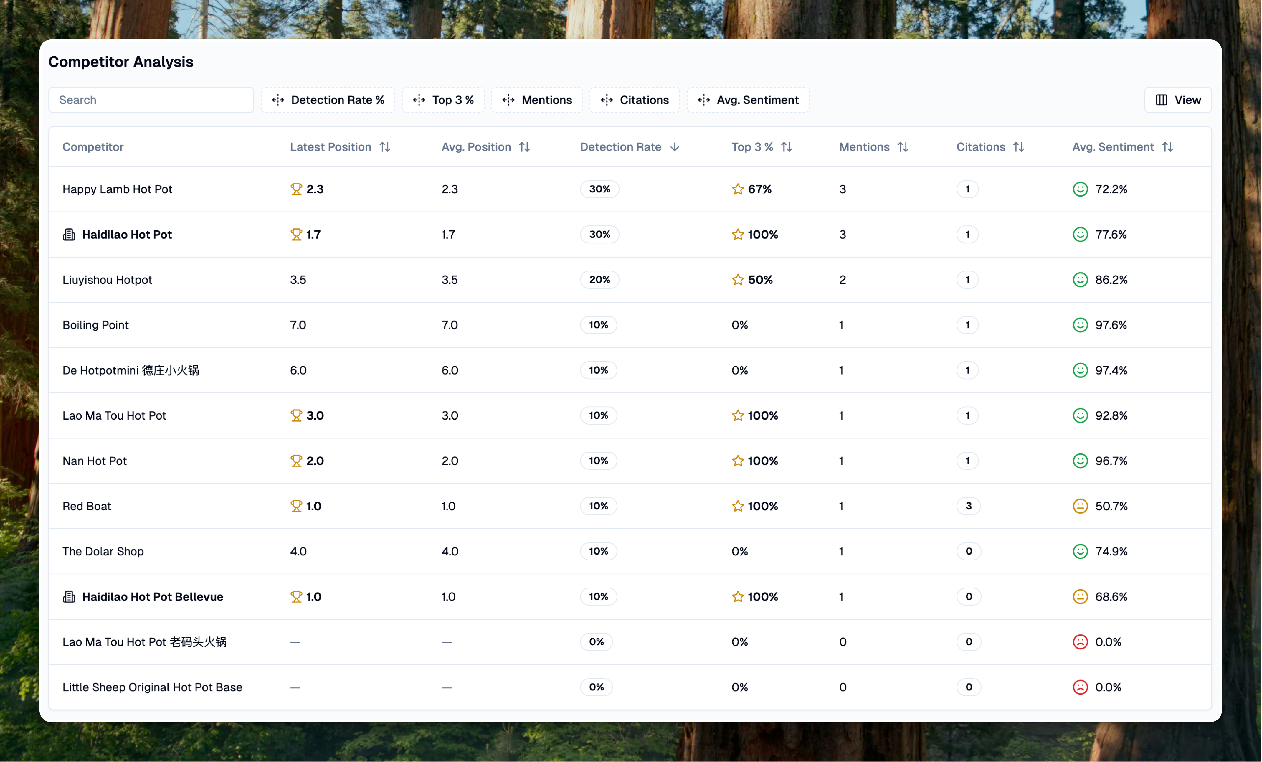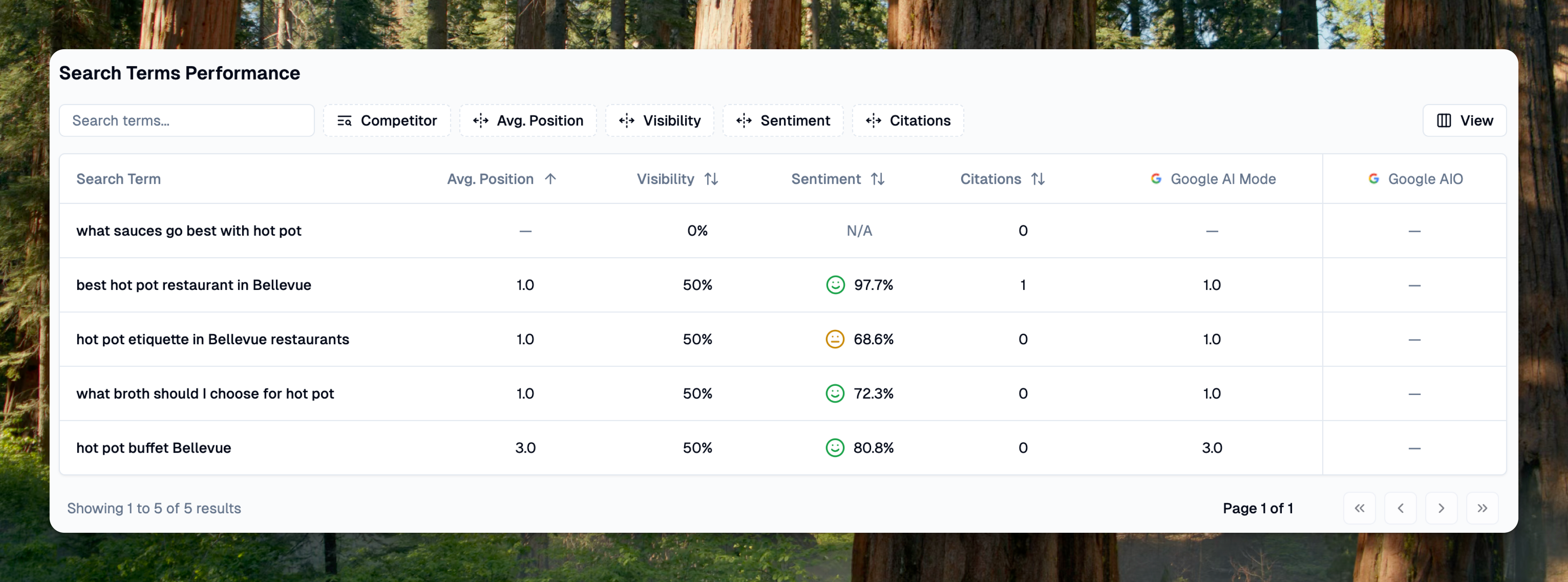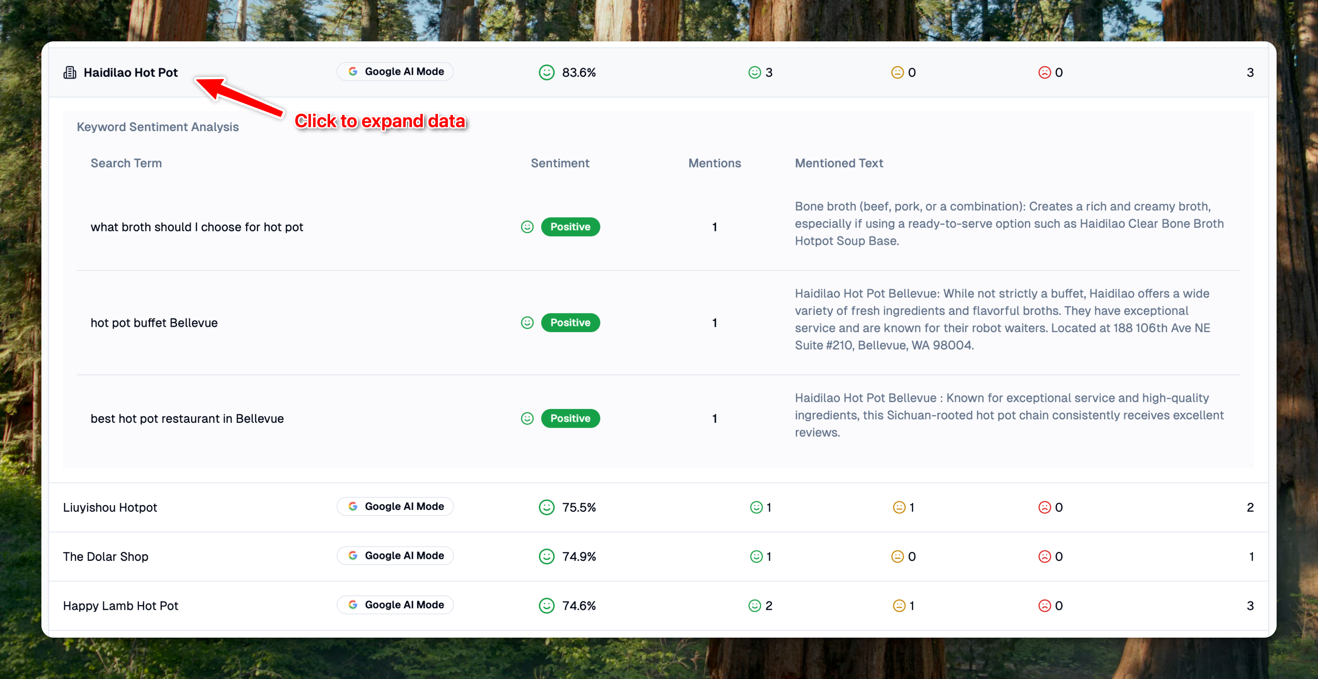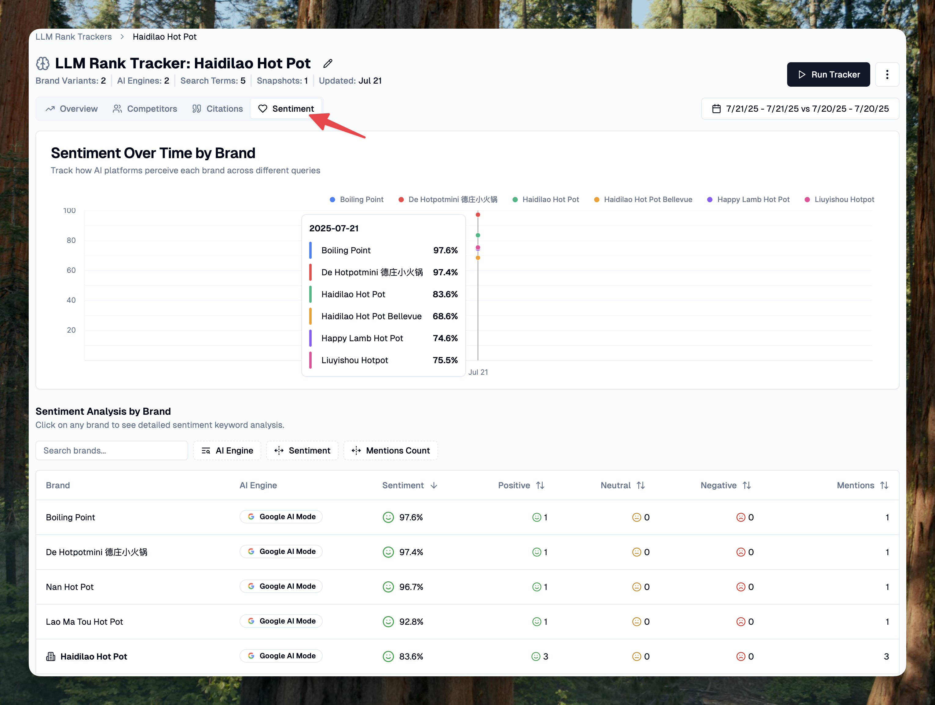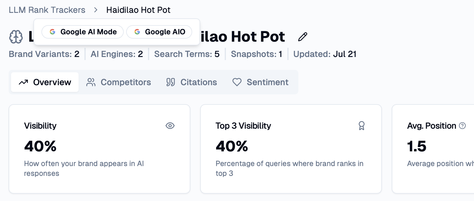 This tool enables you to monitor your brand's visibility and sentiment across AI-powered search results, including Google AI Overview and Google AI Mode. Track how often your brand appears in AI-generated responses, analyze competitor mentions, monitor citations, and measure sentiment over time to understand your brand's presence in the AI search landscape.
