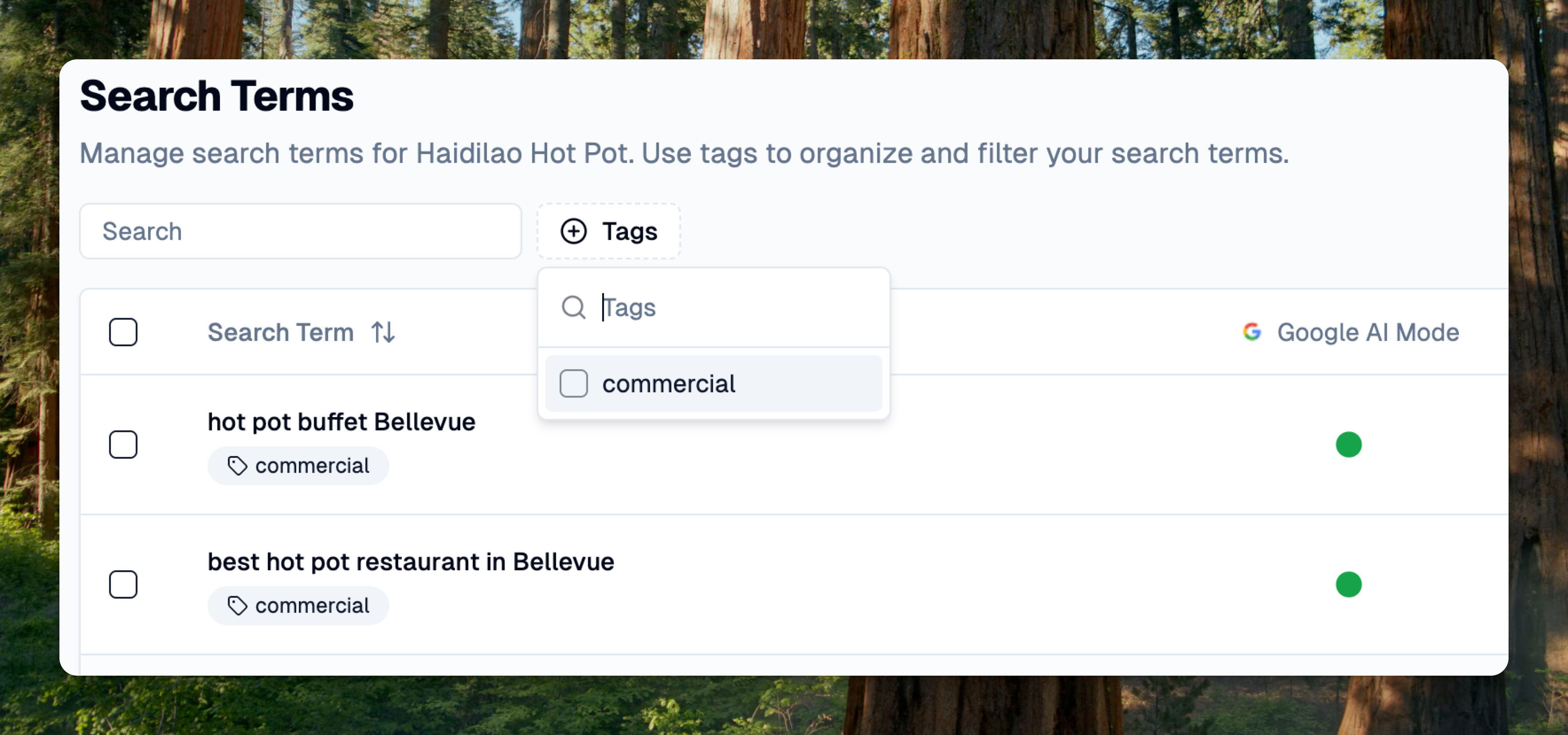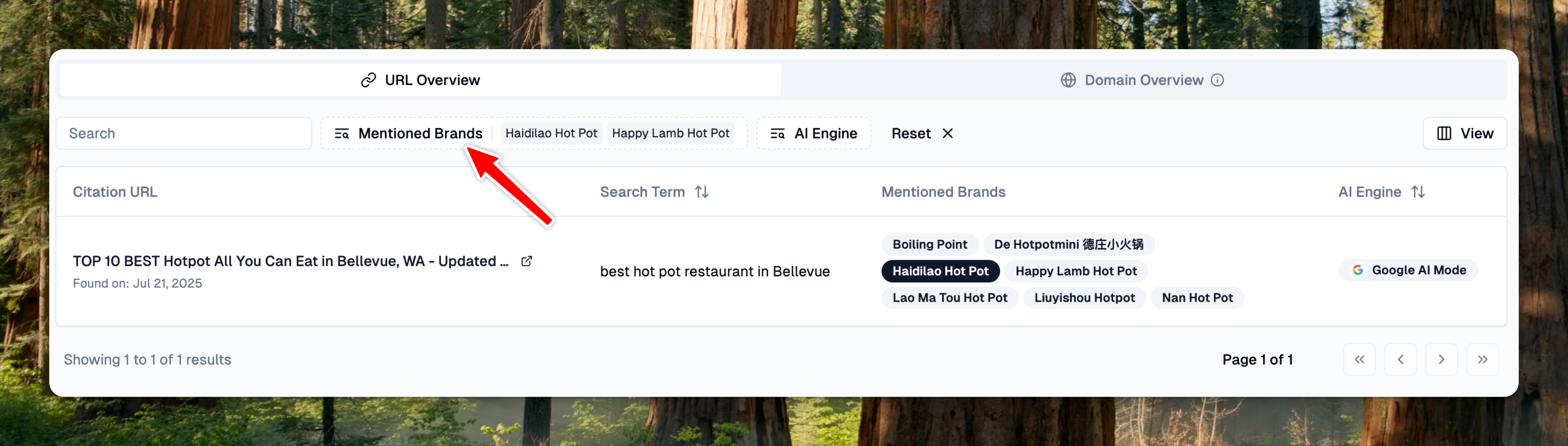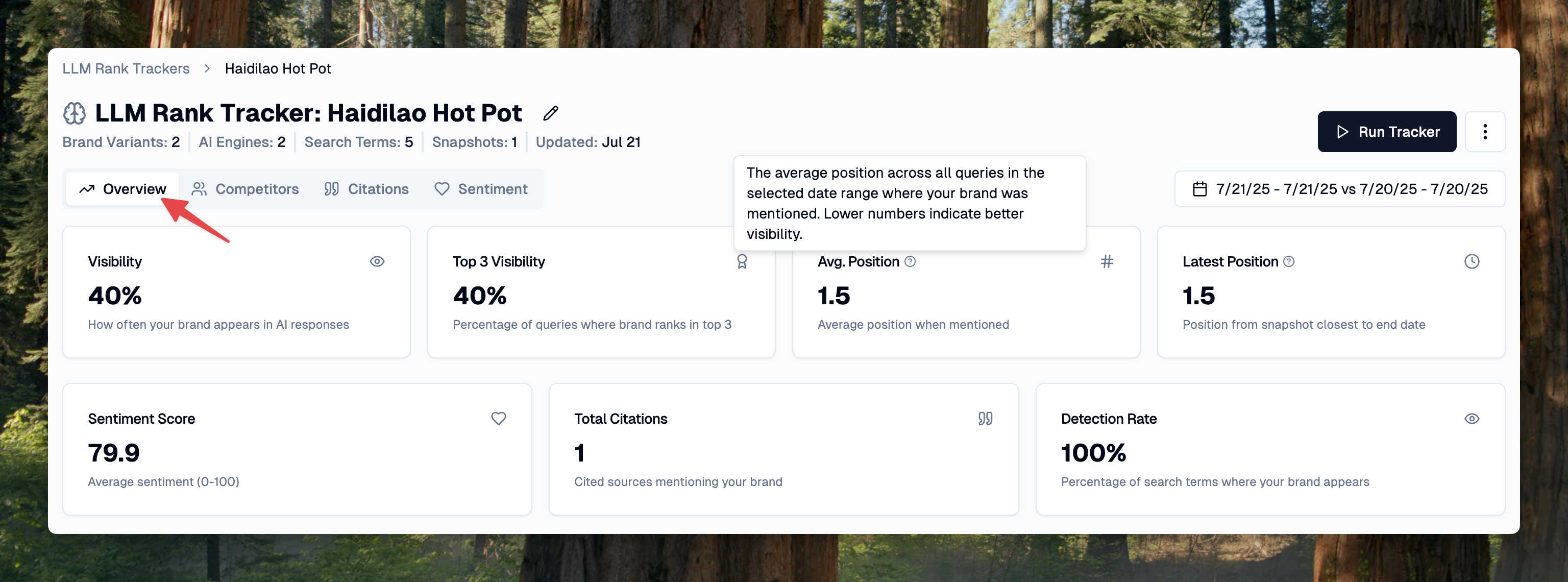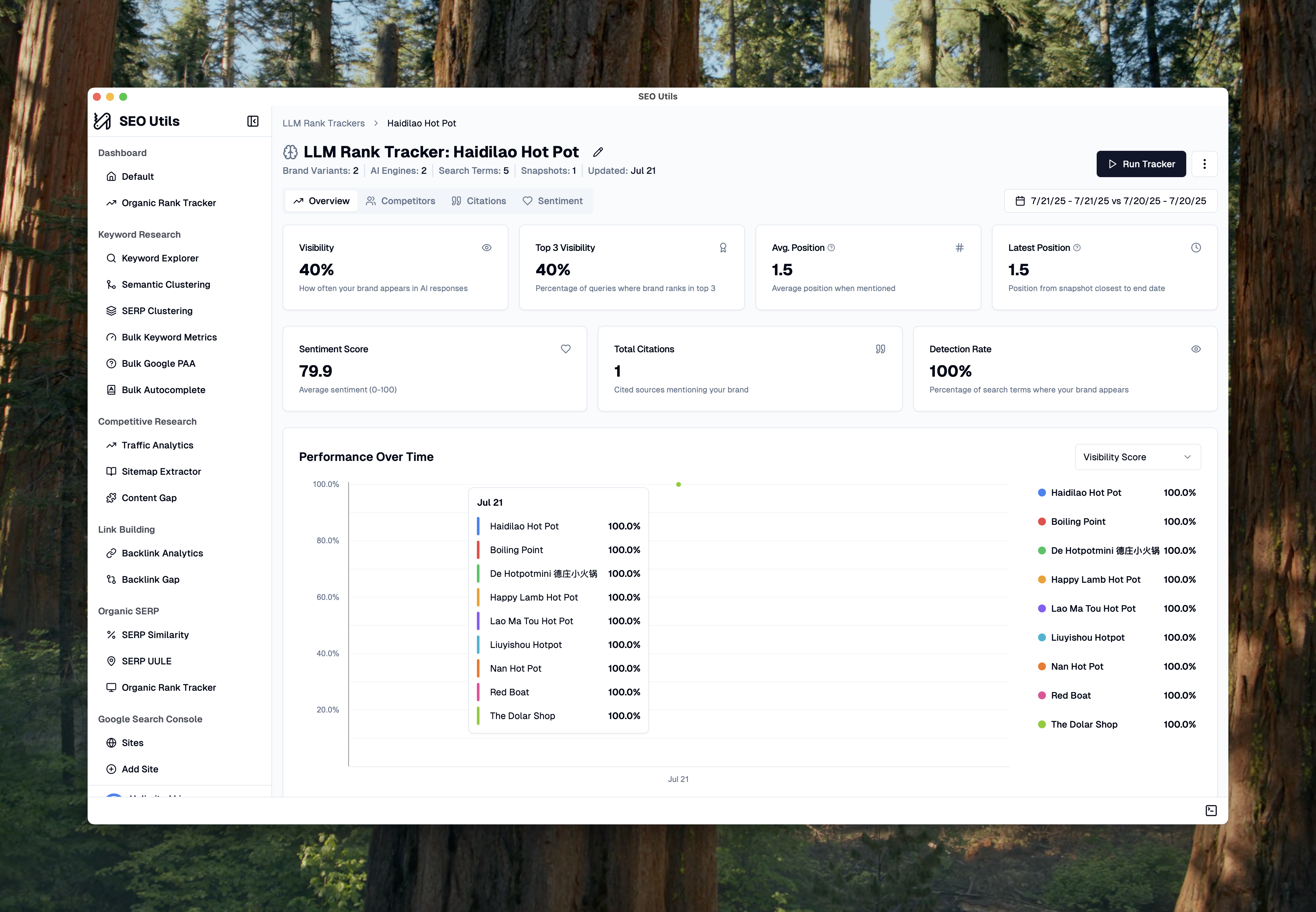 This tool enables you to monitor your brand's visibility and sentiment across AI-powered search results, including Google AI Overview and Google AI Mode. Track how often your brand appears in AI-generated responses, analyze competitor mentions, monitor citations, and measure sentiment over time to understand your brand's presence in the AI search landscape.