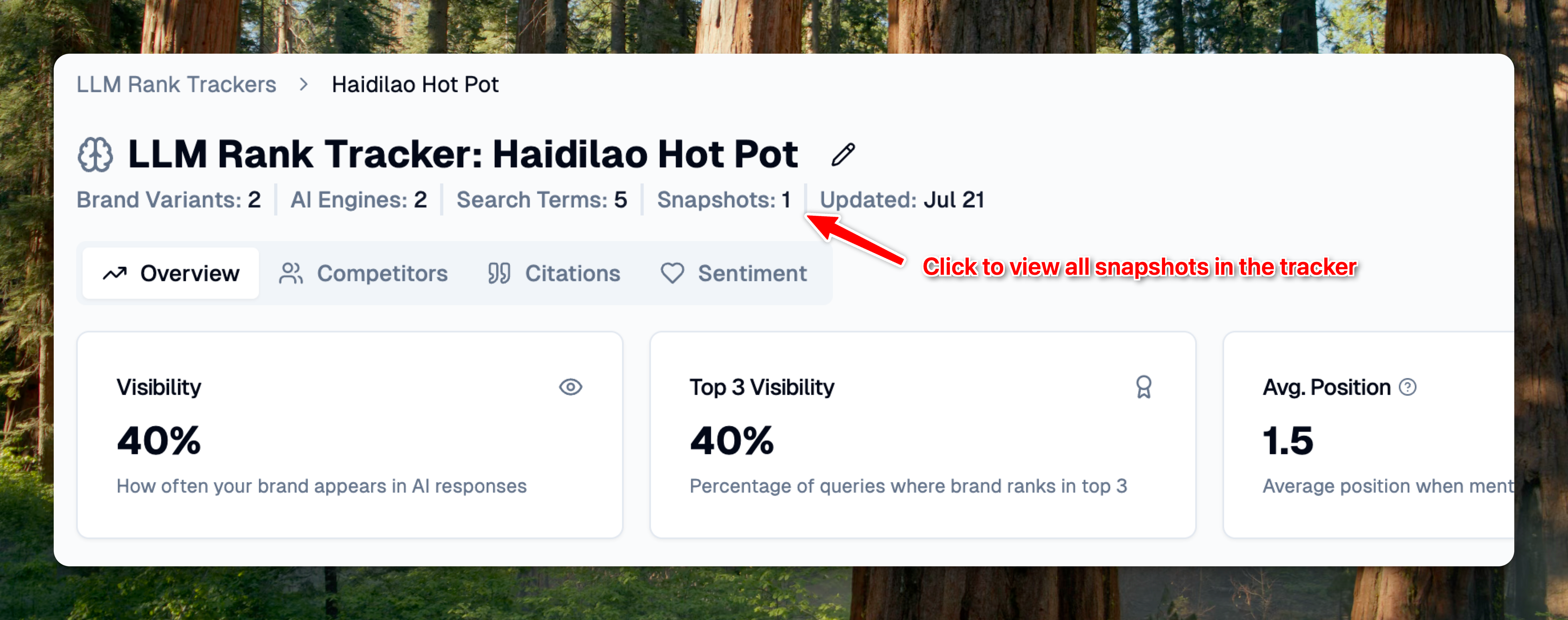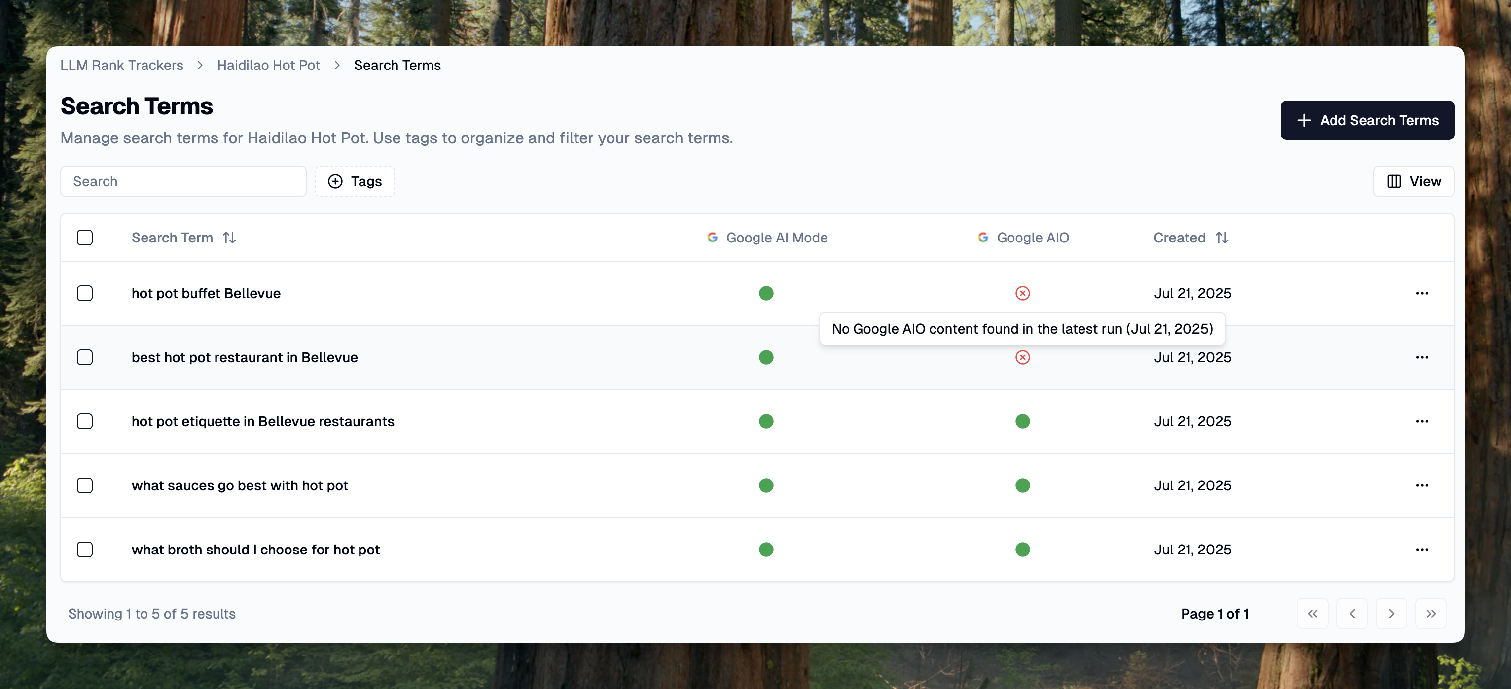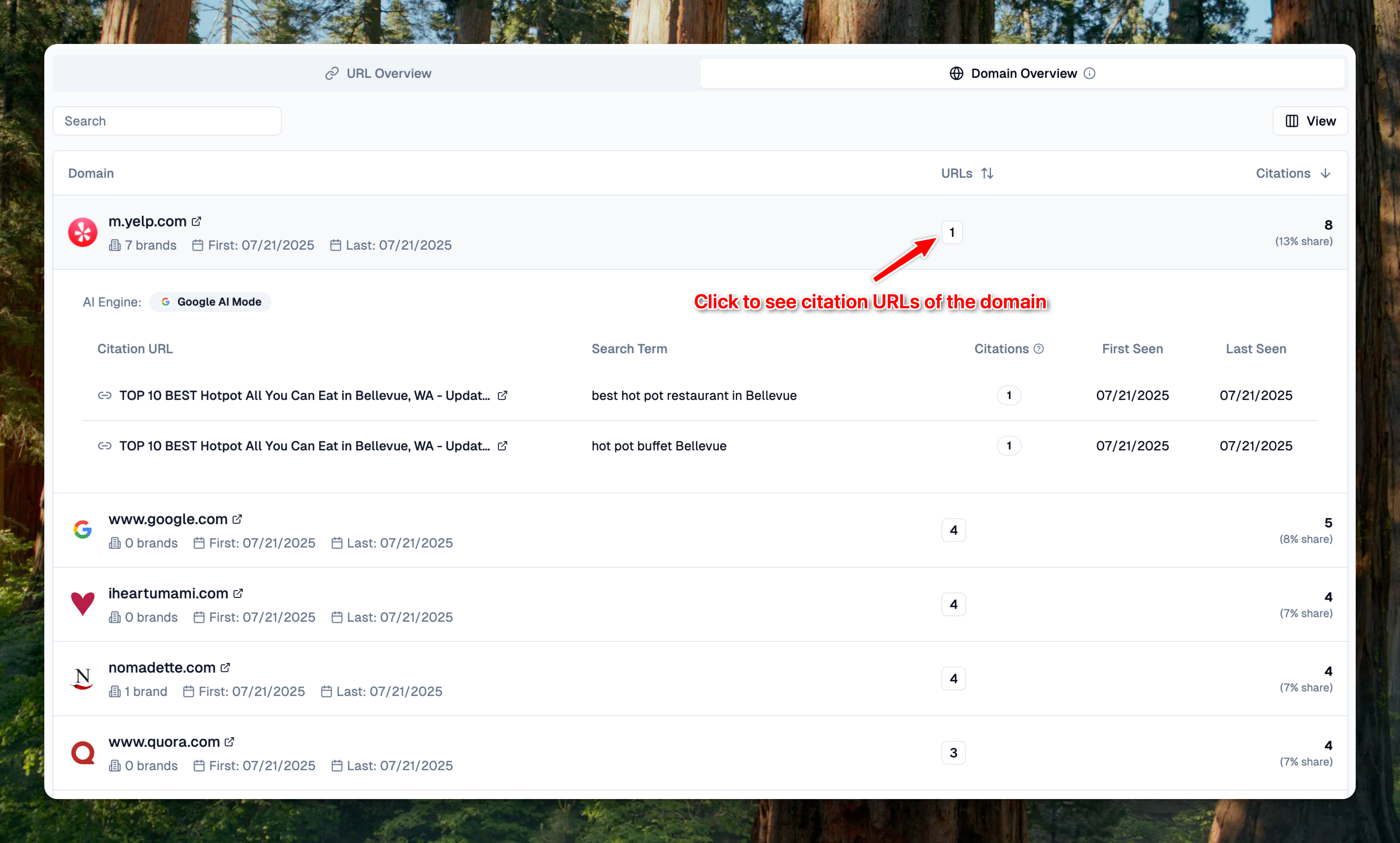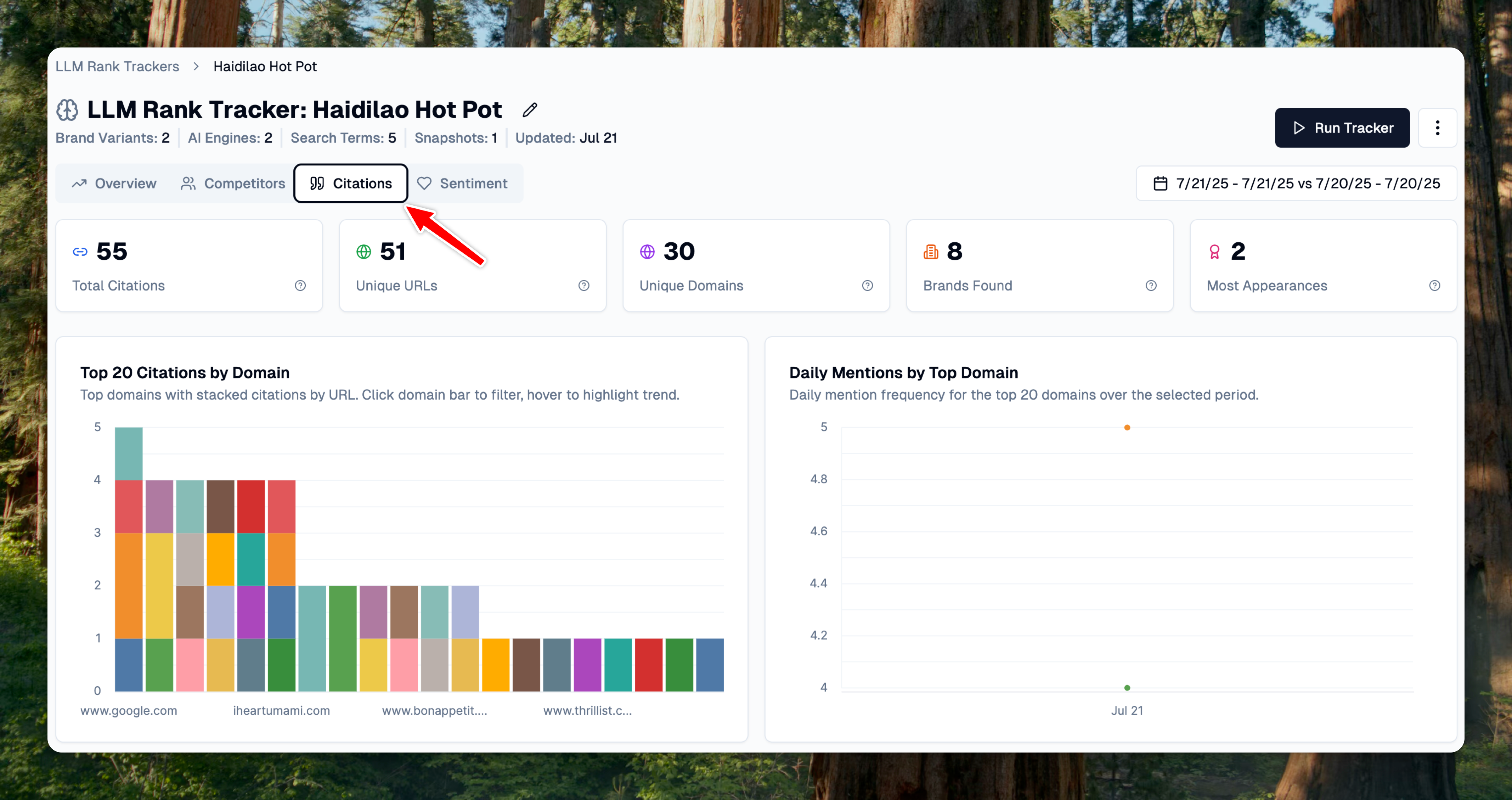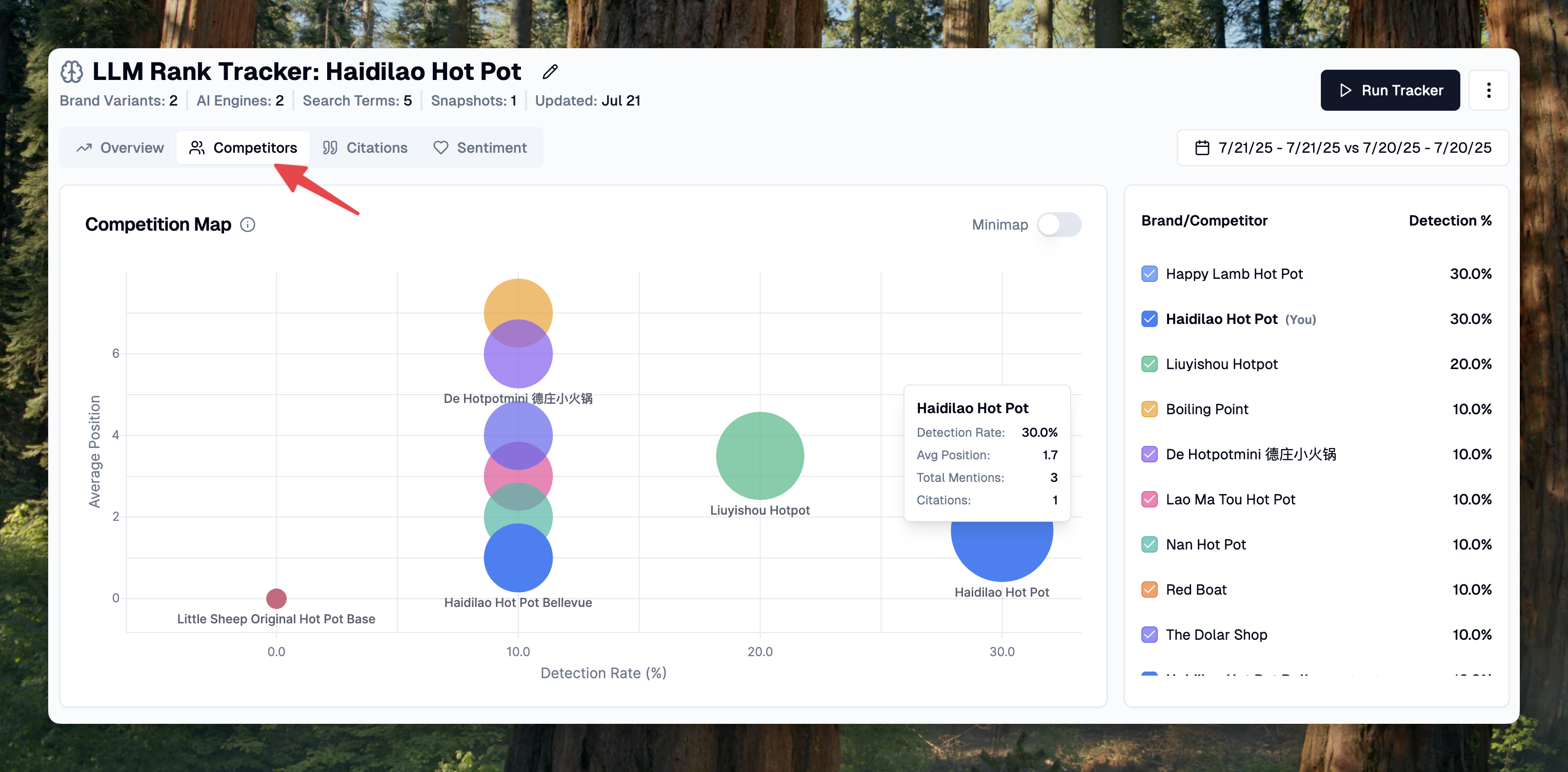 This tool enables you to monitor your brand's visibility and sentiment across AI-powered search results, including Google AI Overview and Google AI Mode. Track how often your brand appears in AI-generated responses, analyze competitor mentions, monitor citations, and measure sentiment over time to understand your brand's presence in the AI search landscape.