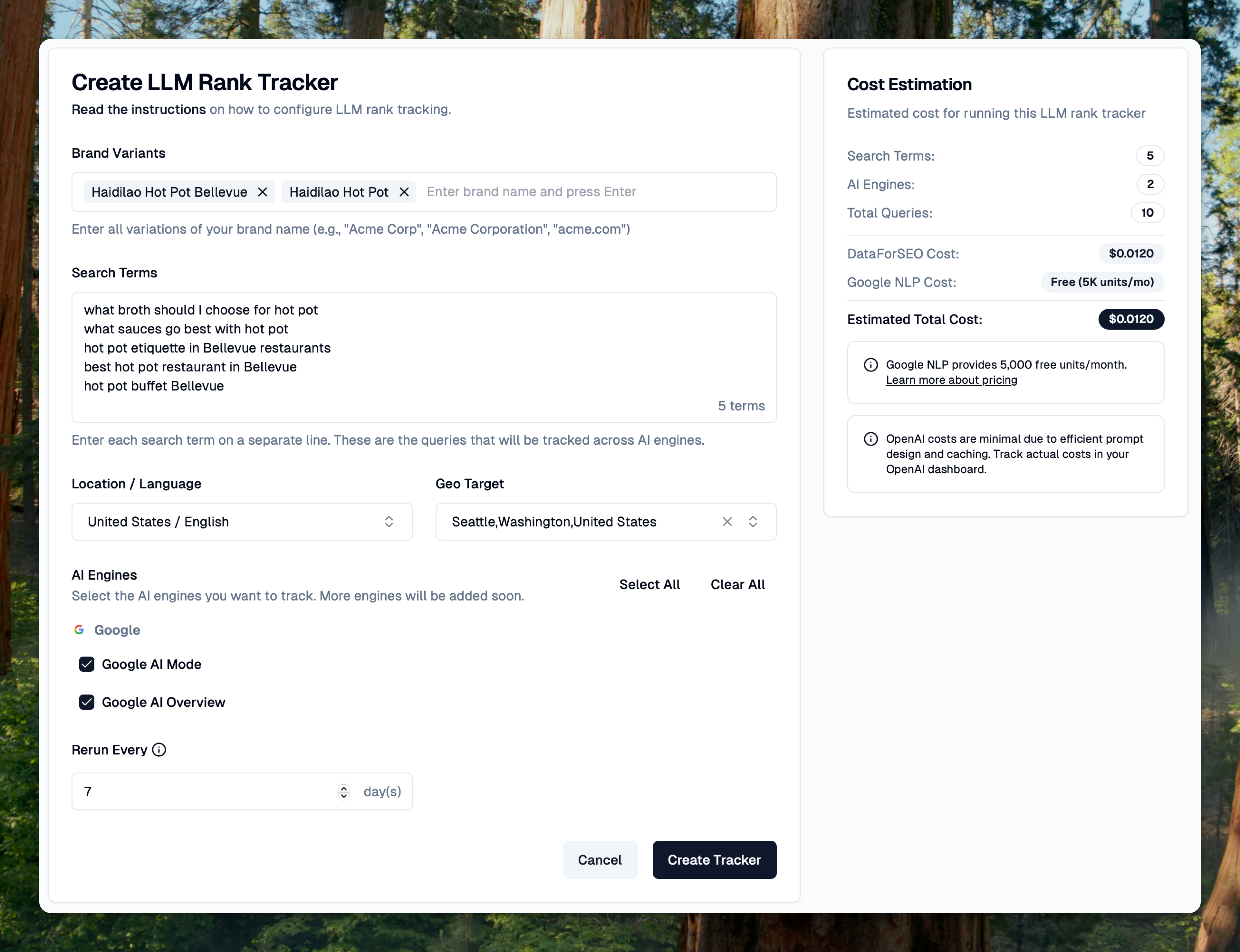 Creating an LLM Rank Tracker involves configuring what to track (your brand variants), where to track (AI engines), and how to track (search terms and schedule).