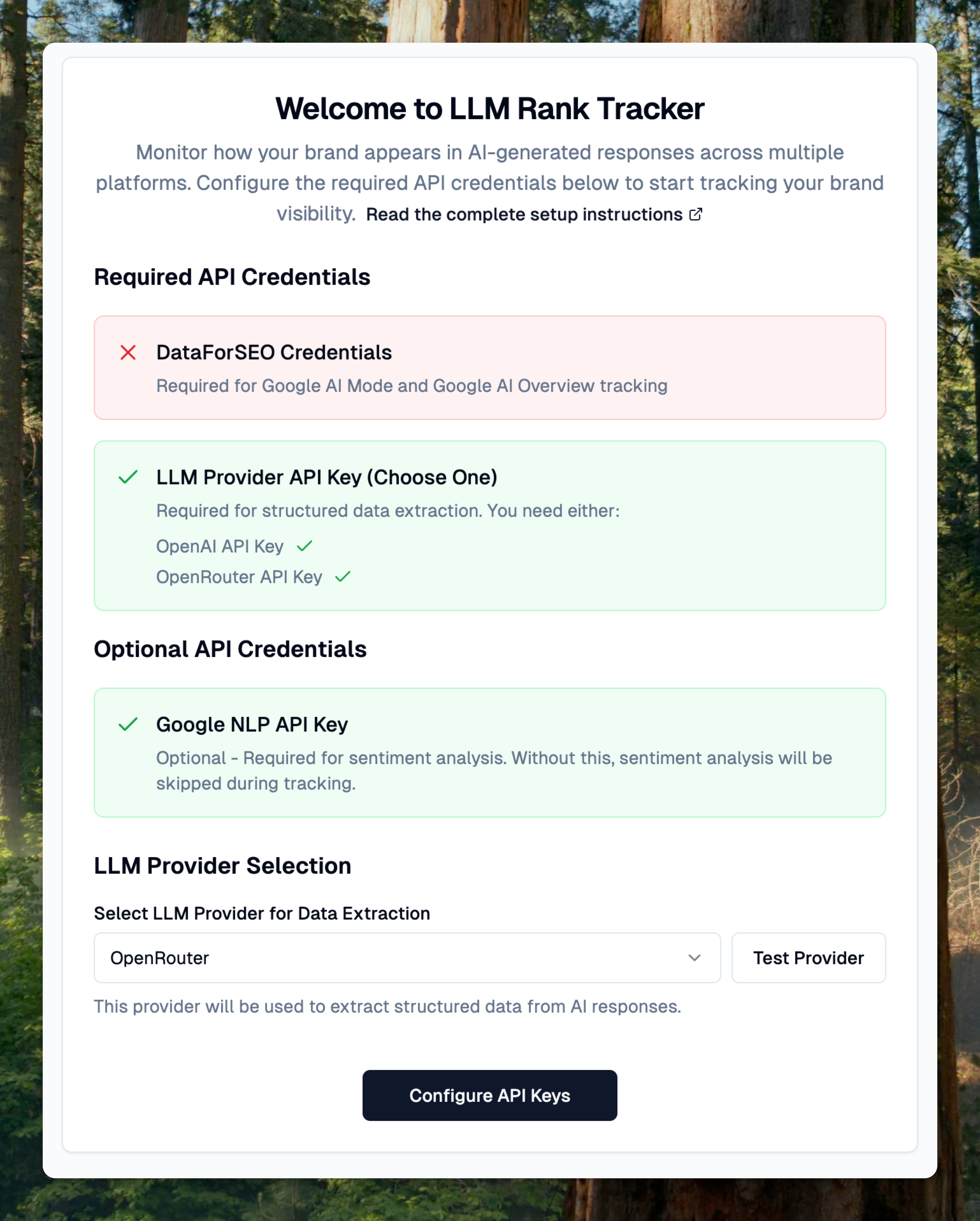 Before you can start tracking your brand in AI responses, you need to configure the required API credentials. The LLM Rank Tracker requires two different API services to function properly.
