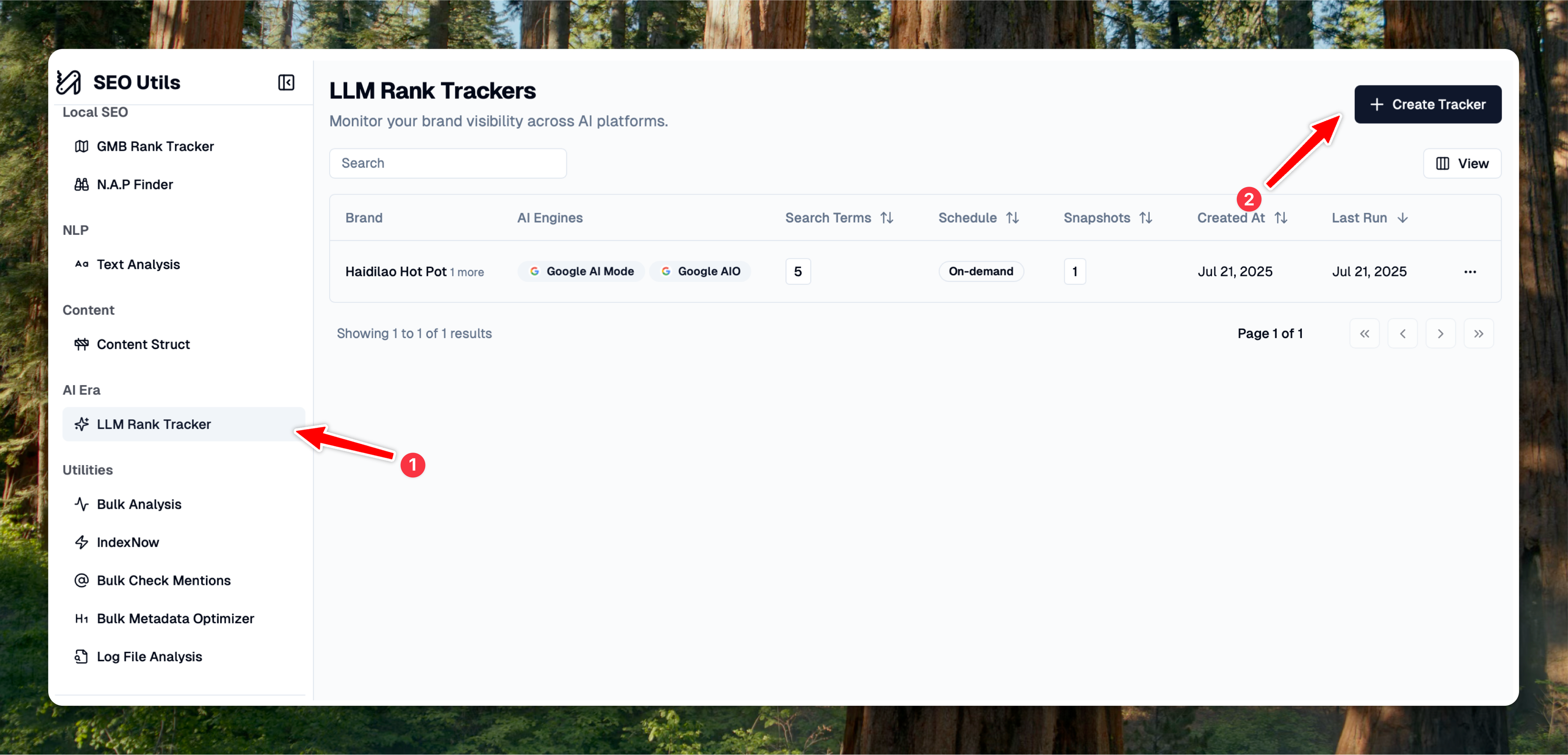 Navigate to the LLM Rank Tracker section from the main menu. You'll see a list of existing trackers (if any) and an "Add LLM Rank Tracker" button in the top-right corner.