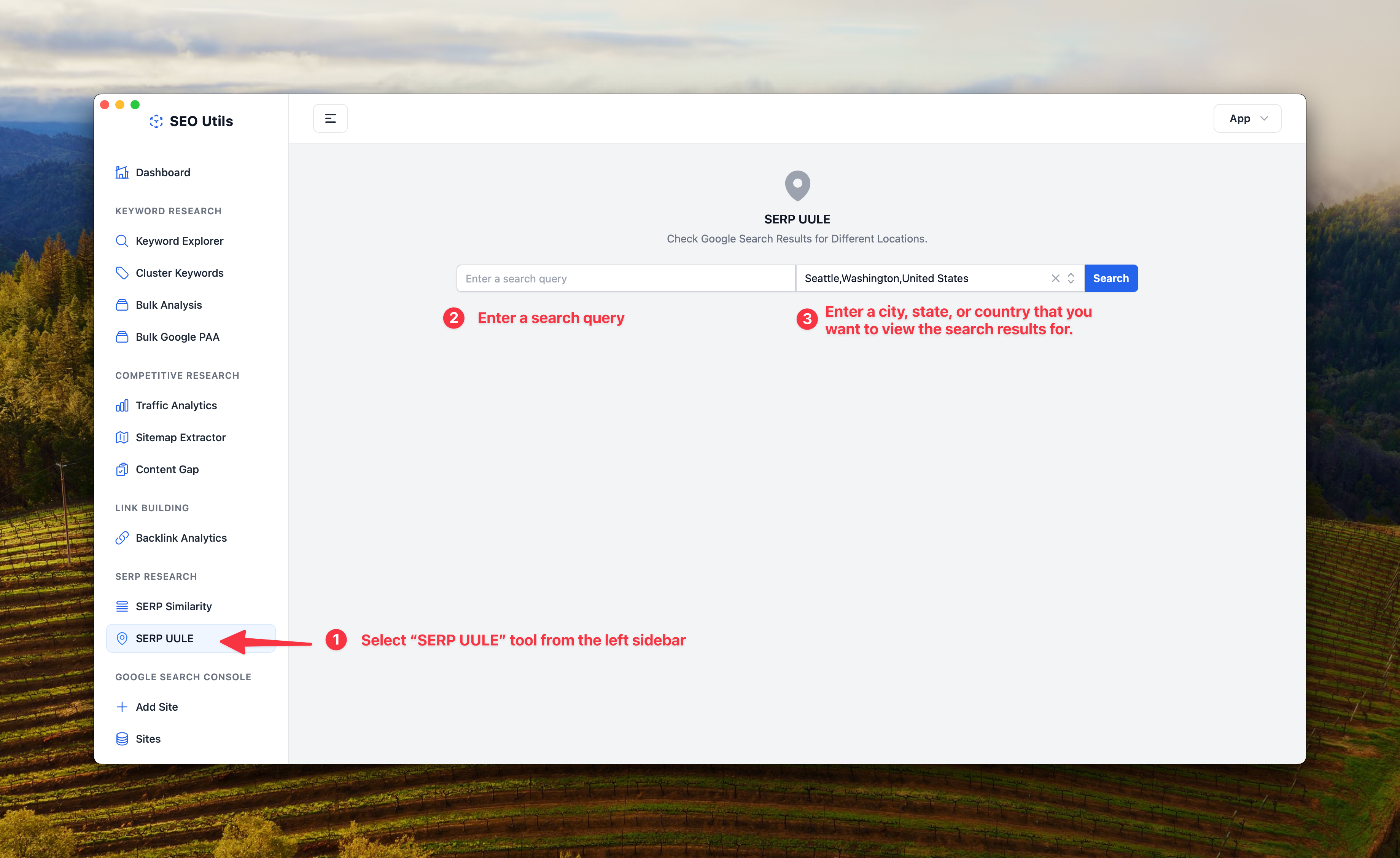 1. Click the "SERP UULE" tool in the left sidebar.
