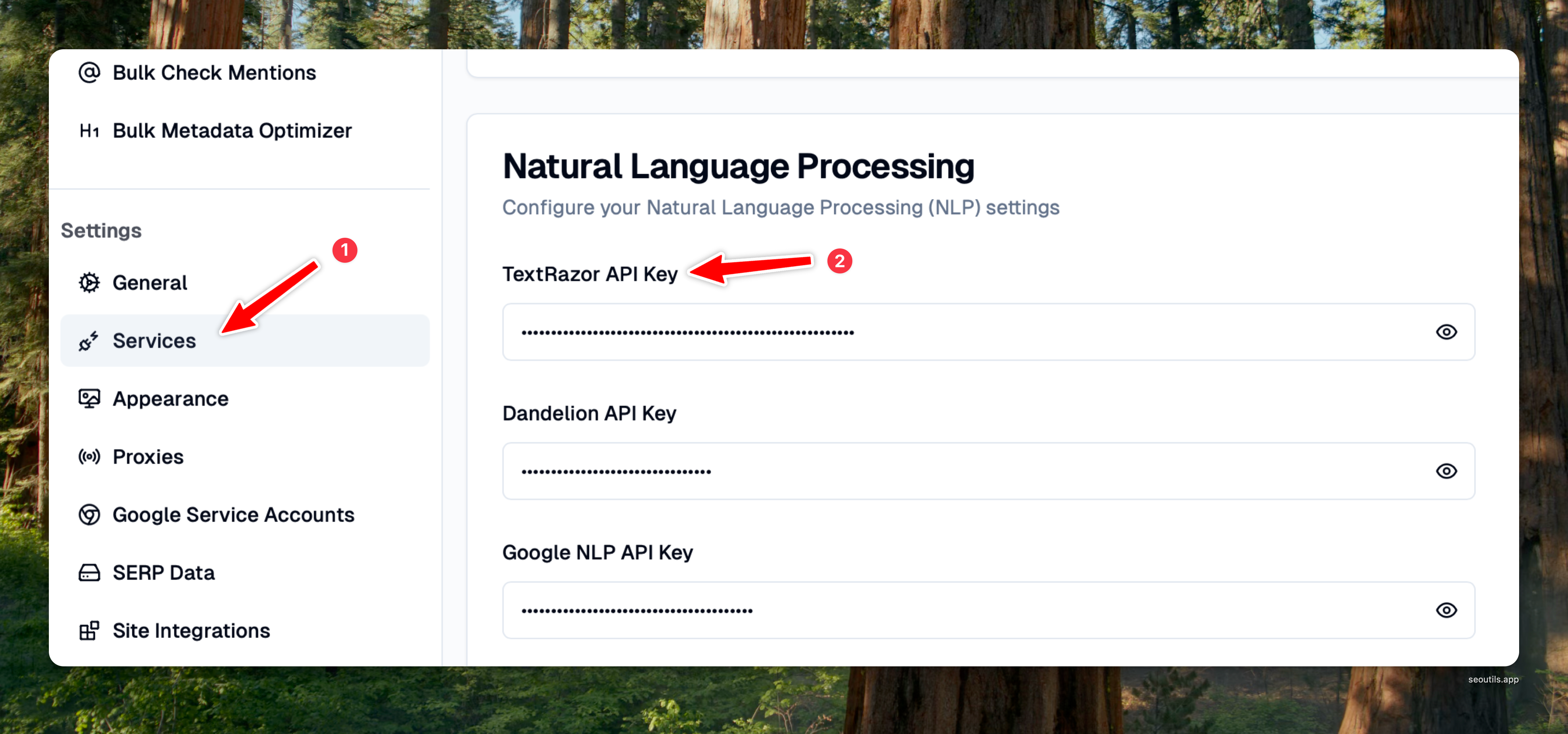 To enter the API key to SEO Utils, please visit the **Services** > **Natural Language Processing** page.