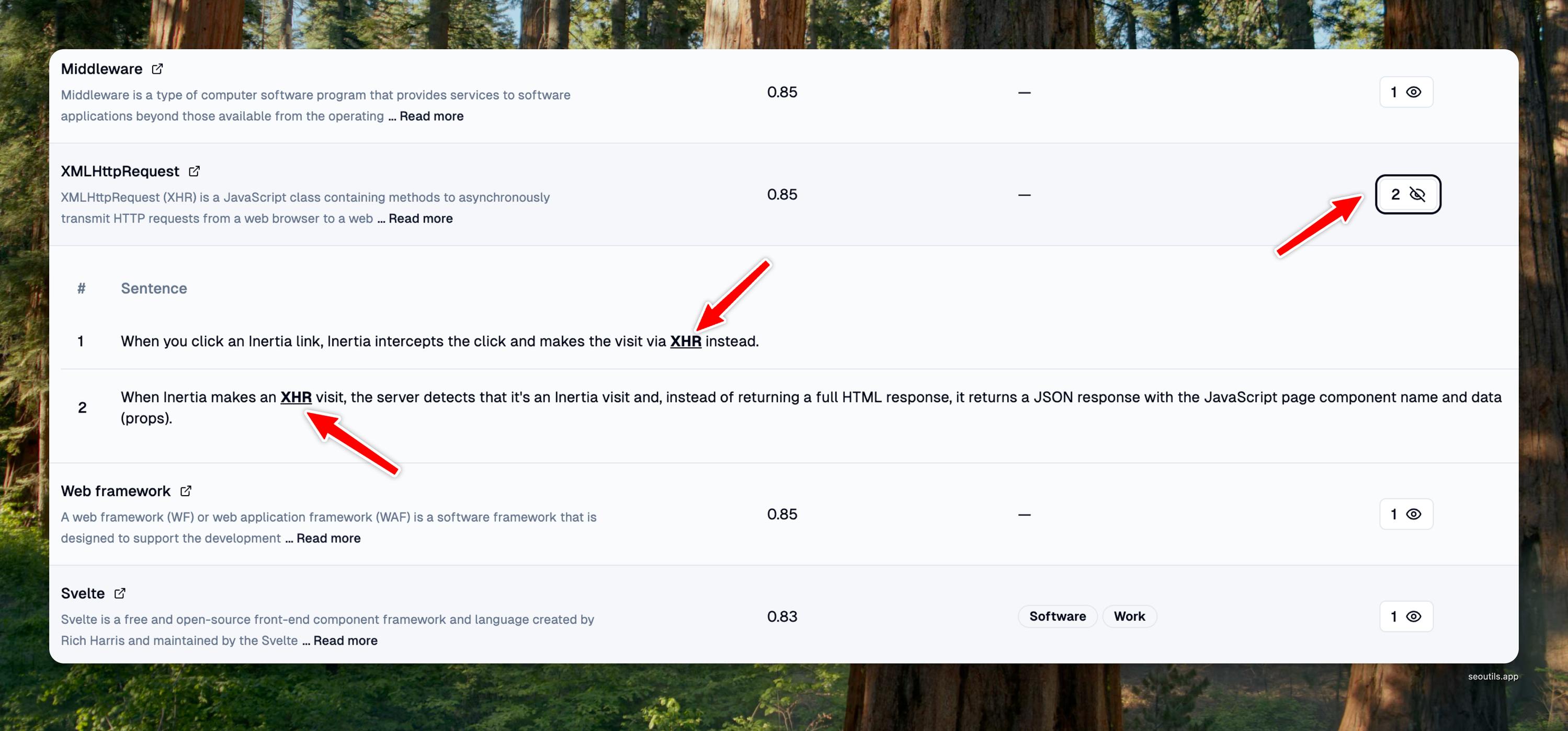 You can see how many times each entity appears in your content by clicking the toggle button on each entity row in the table.