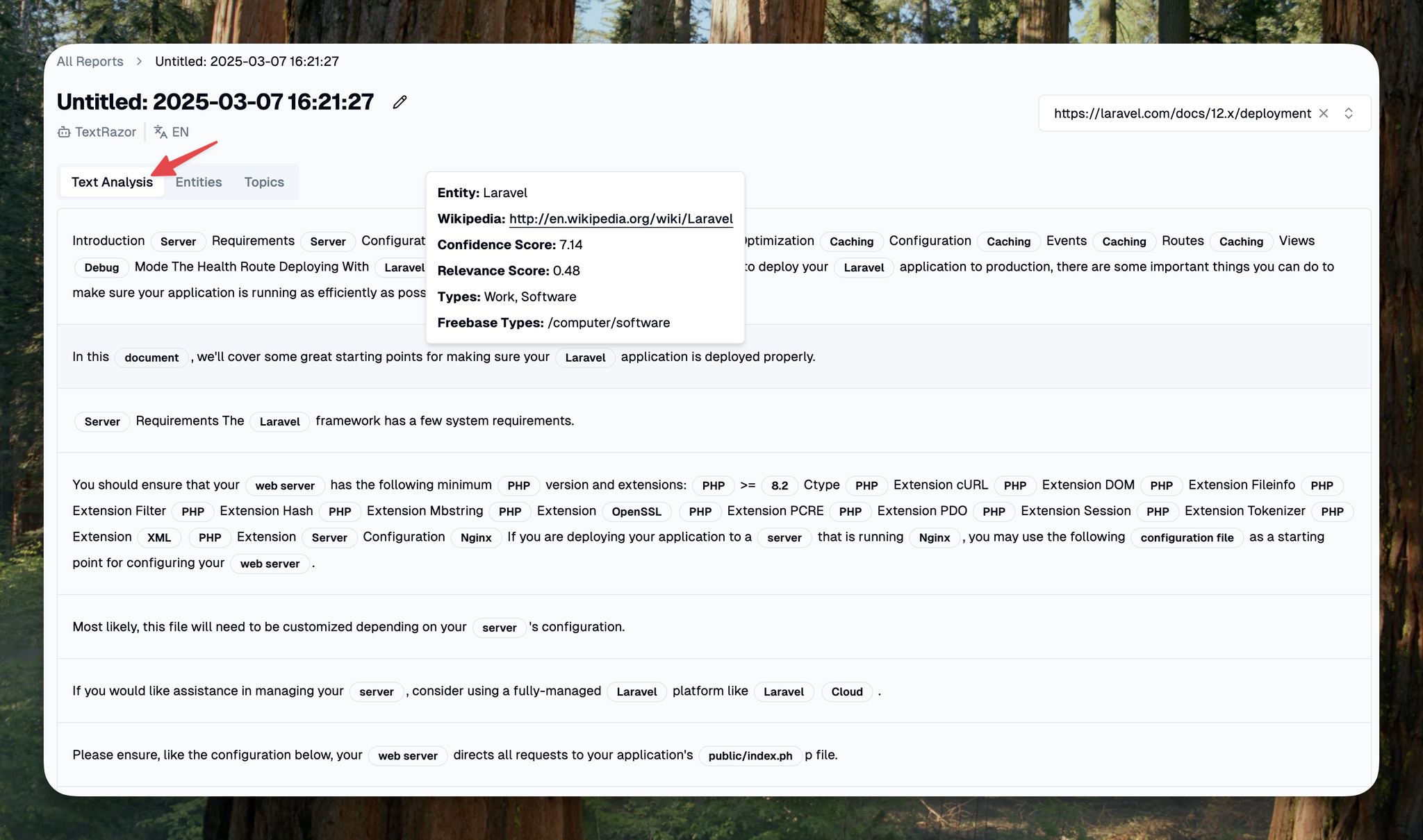 The **Text Analysis** tab breaks your content down sentence by sentence and highlights all detected entities. Simply hover over an entity to view its details!