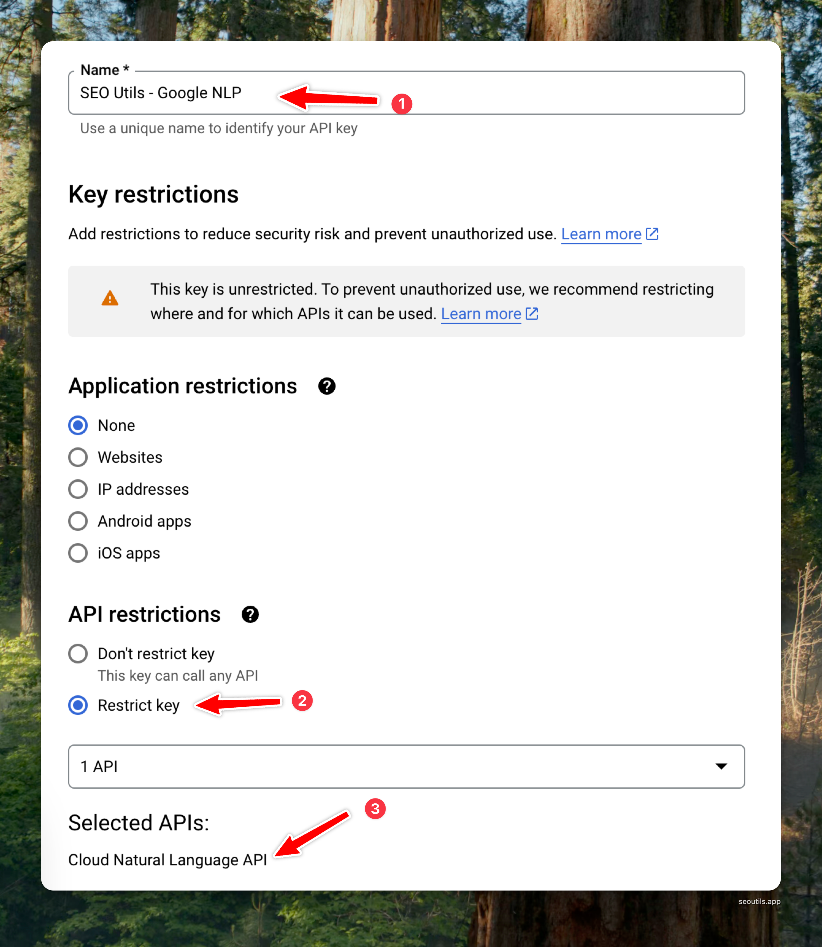 You can edit the API key to add a name and restrict access. It is recommended to restrict the key to only allow access to the Cloud Natural Language API.