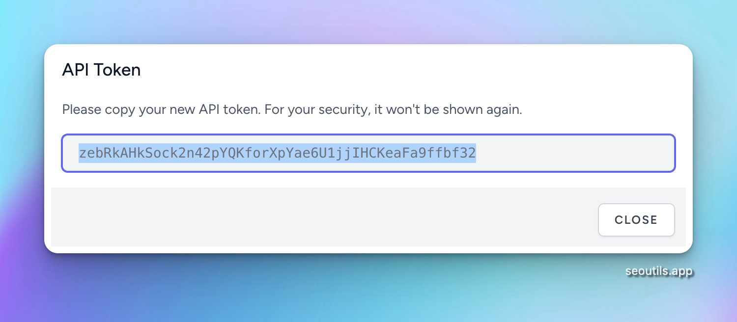 Step 3: Click on the "Create" button, and the system will display the API Token. Copy the token before clicking the "Close" button, as the token will never be displayed again.