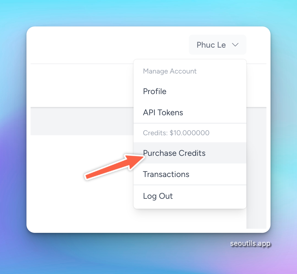 Step 2: After logging in, click the user dropdown in the top-right corner and select "Purchase Credits."