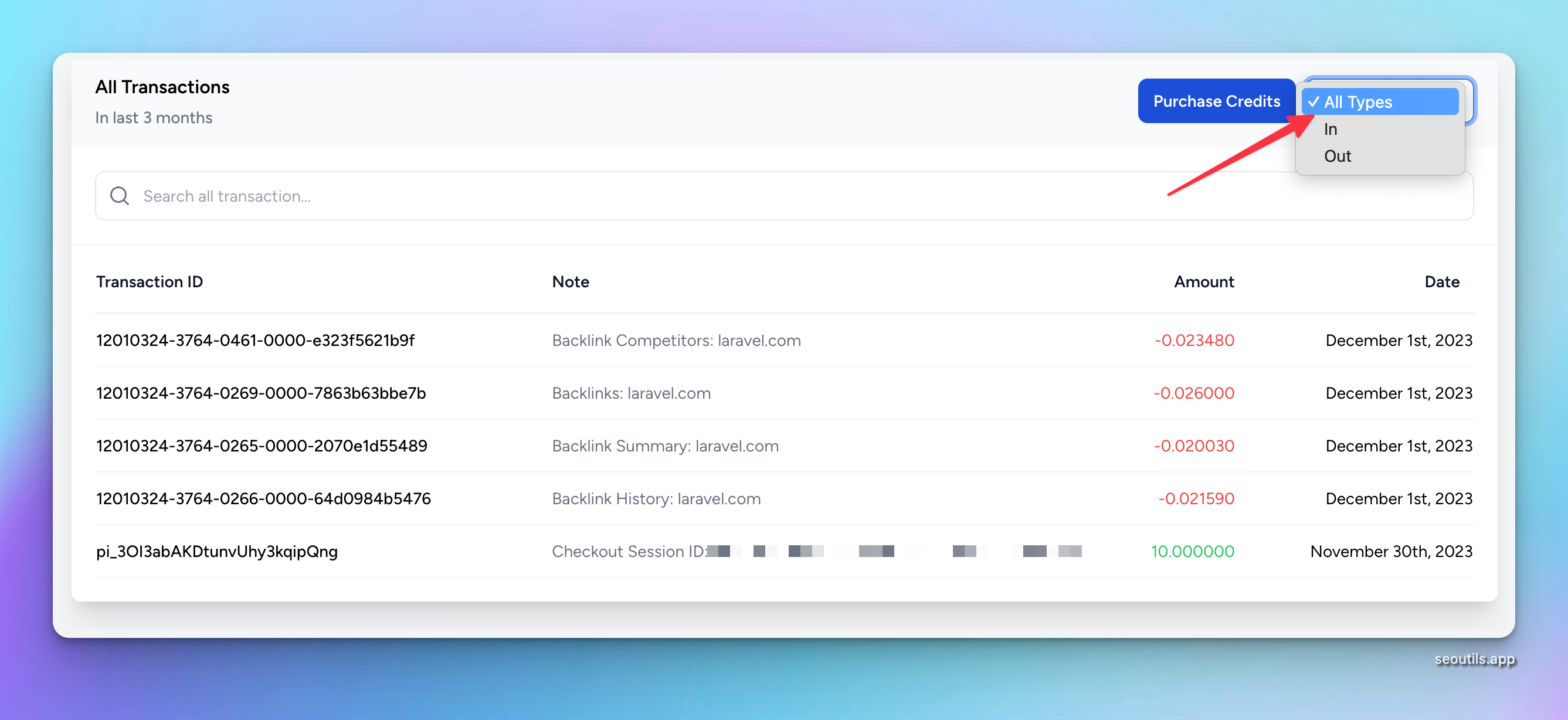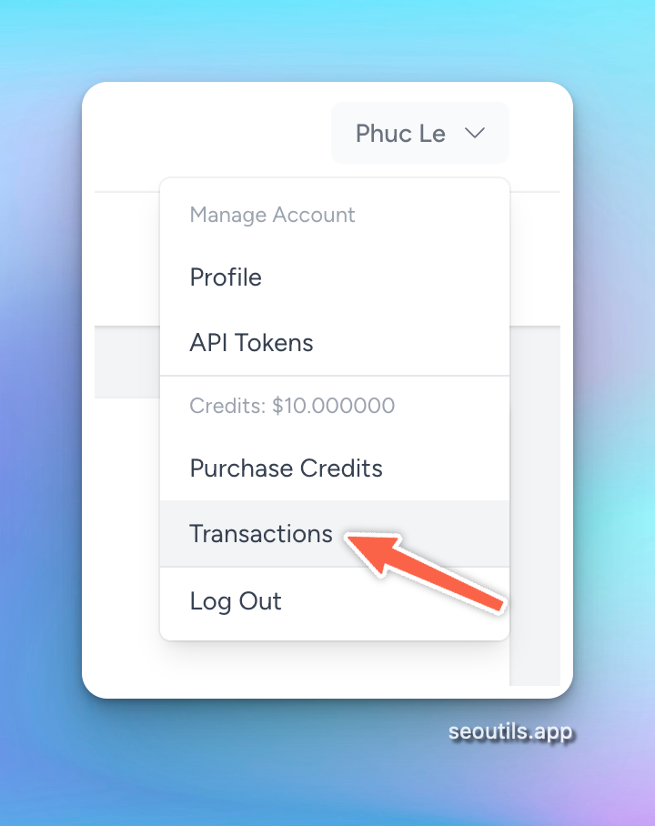 You can view all credit transactions by clicking the Transactions menu from the user dropdown menu.