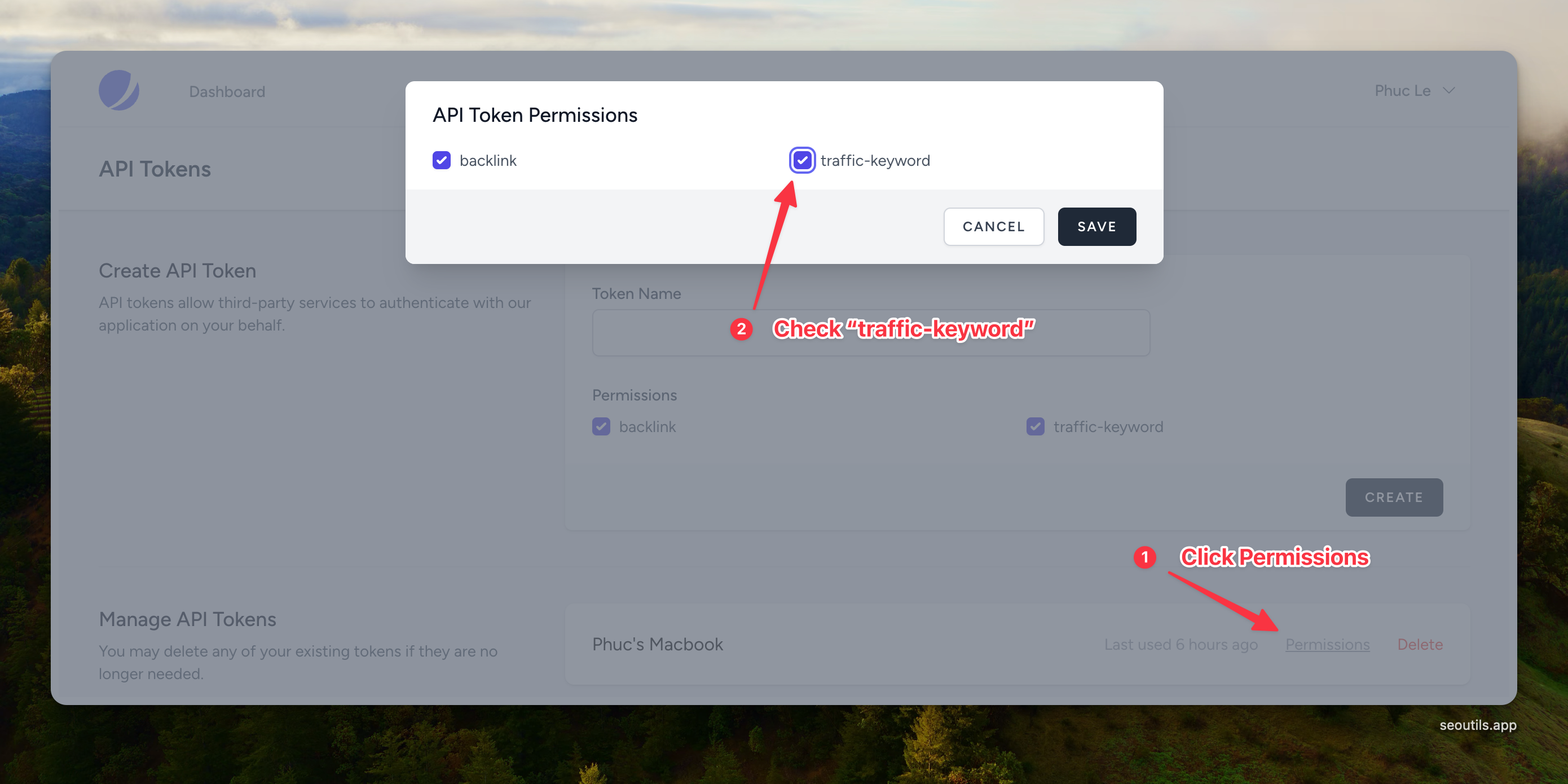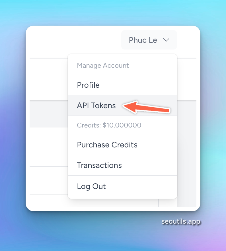 Step 1: Visit https://app.seoutils.app/ and click the user dropdown in the top-right corner and select "API Tokens".