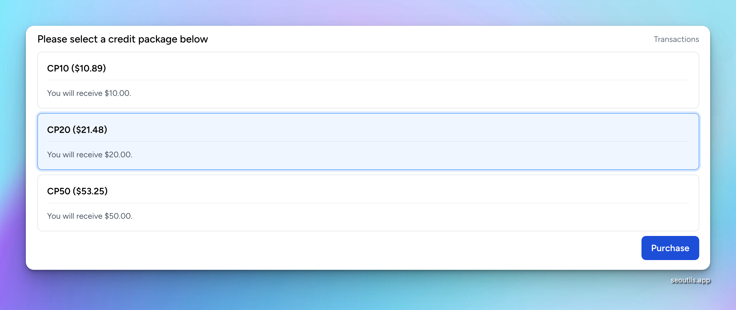 Step 3: Select the credit package that you would like to purchase and click the "Purchase" button. You will be redirected to the checkout page.