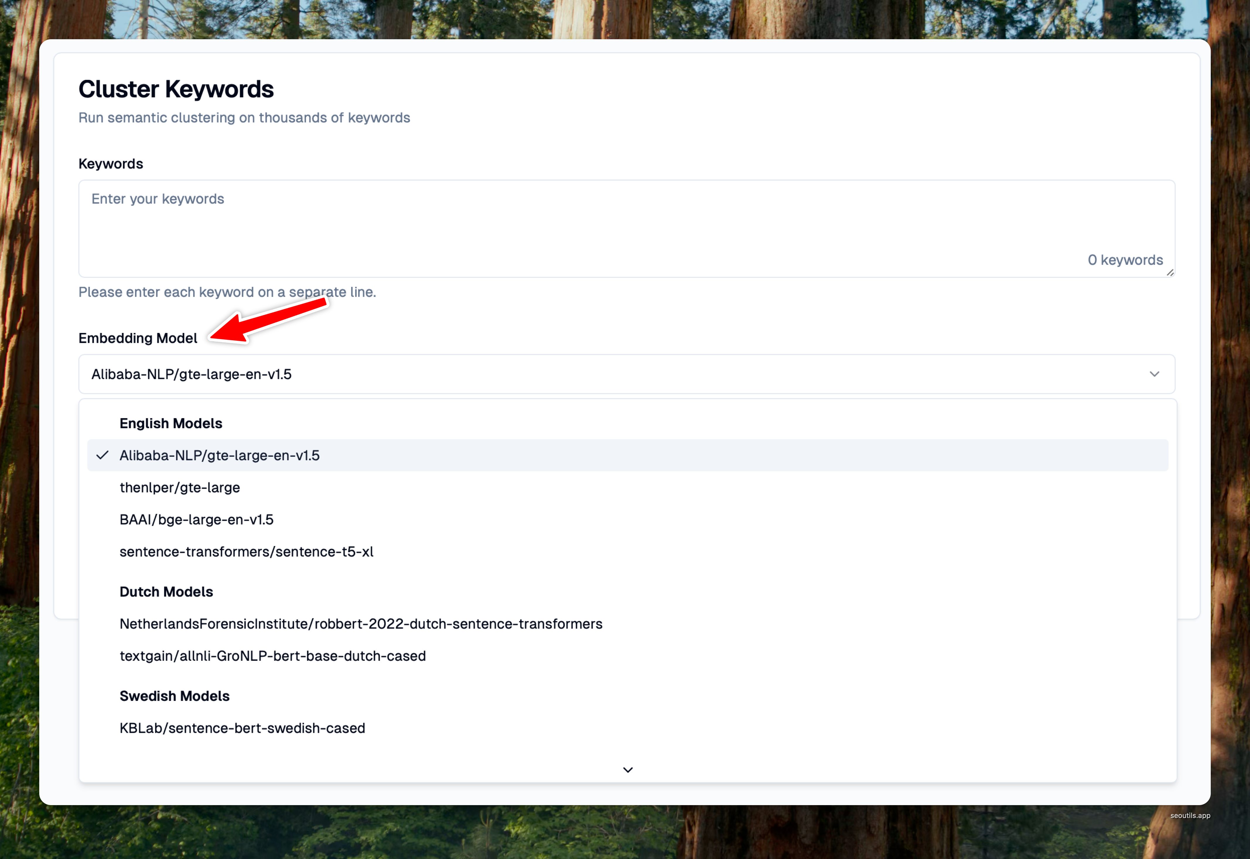 Step 3: Open the Semantic Clustering tool as you normally would. Youβll notice a new field called βEmbedding Modelβ. Simply choose a model from the dropdown based on your language to start clustering keywords.
