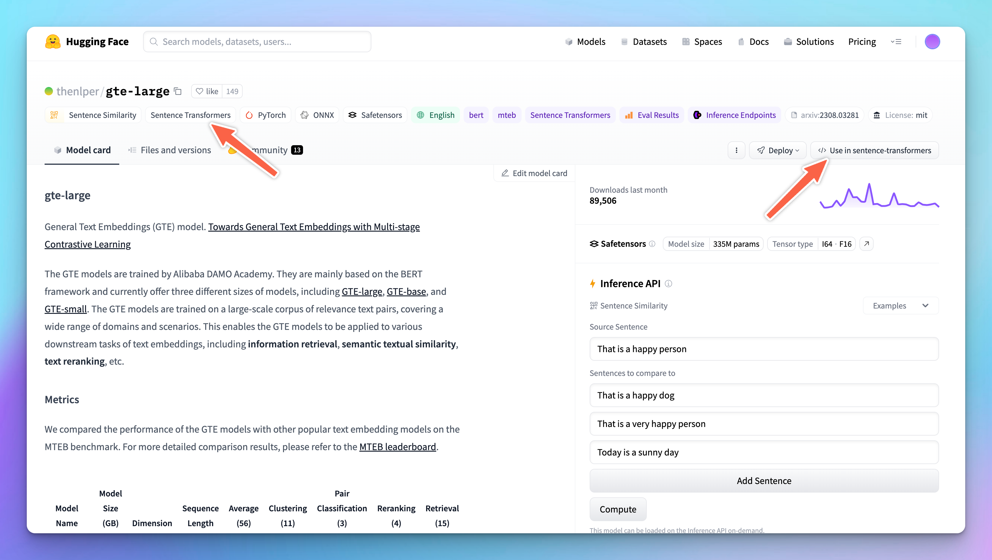 Select one model, for example, https://huggingface.co/thenlper/gte-large