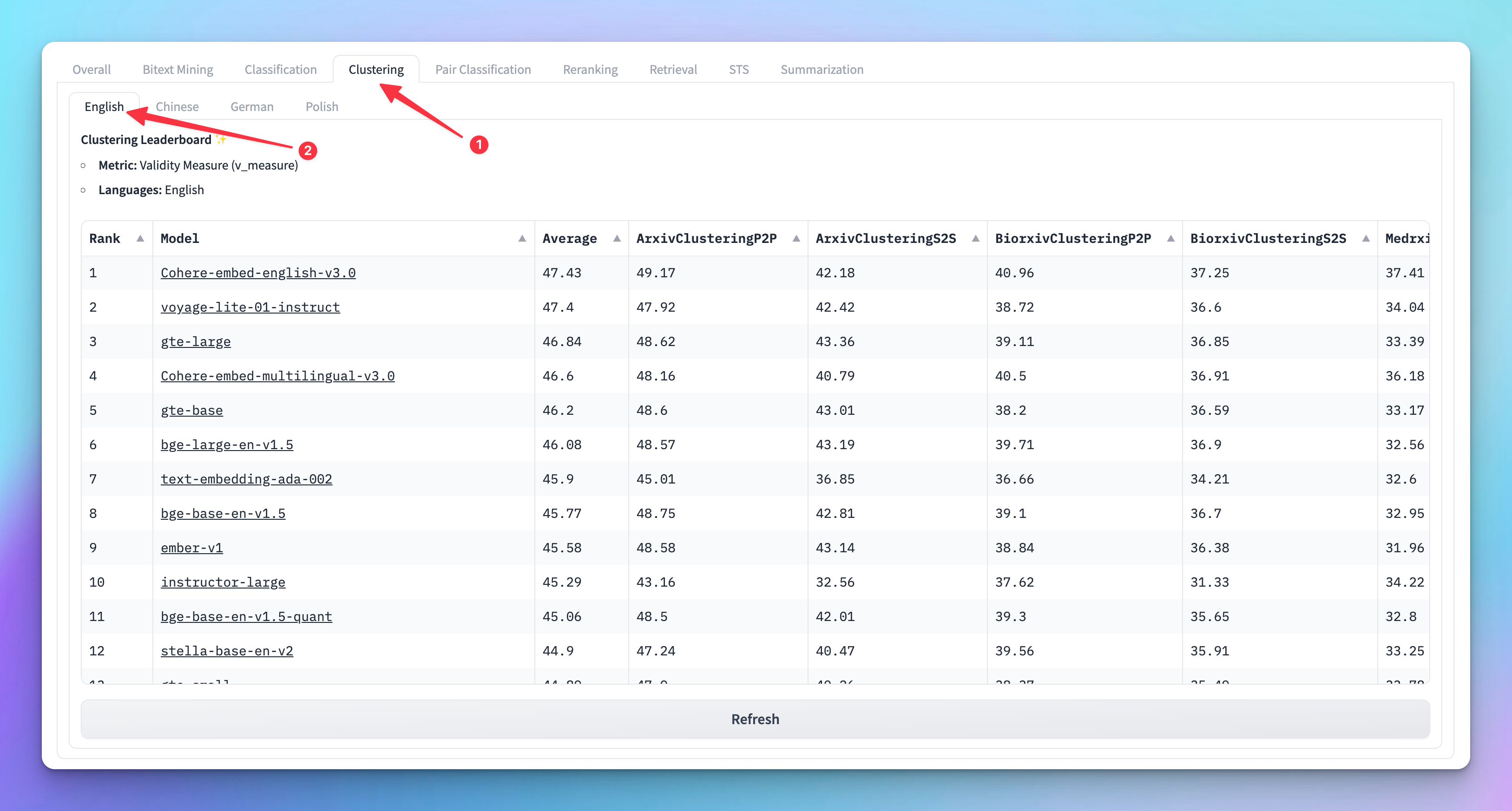 First, you can visit this leaderboard: https://huggingface.co/spaces/mteb/leaderboard